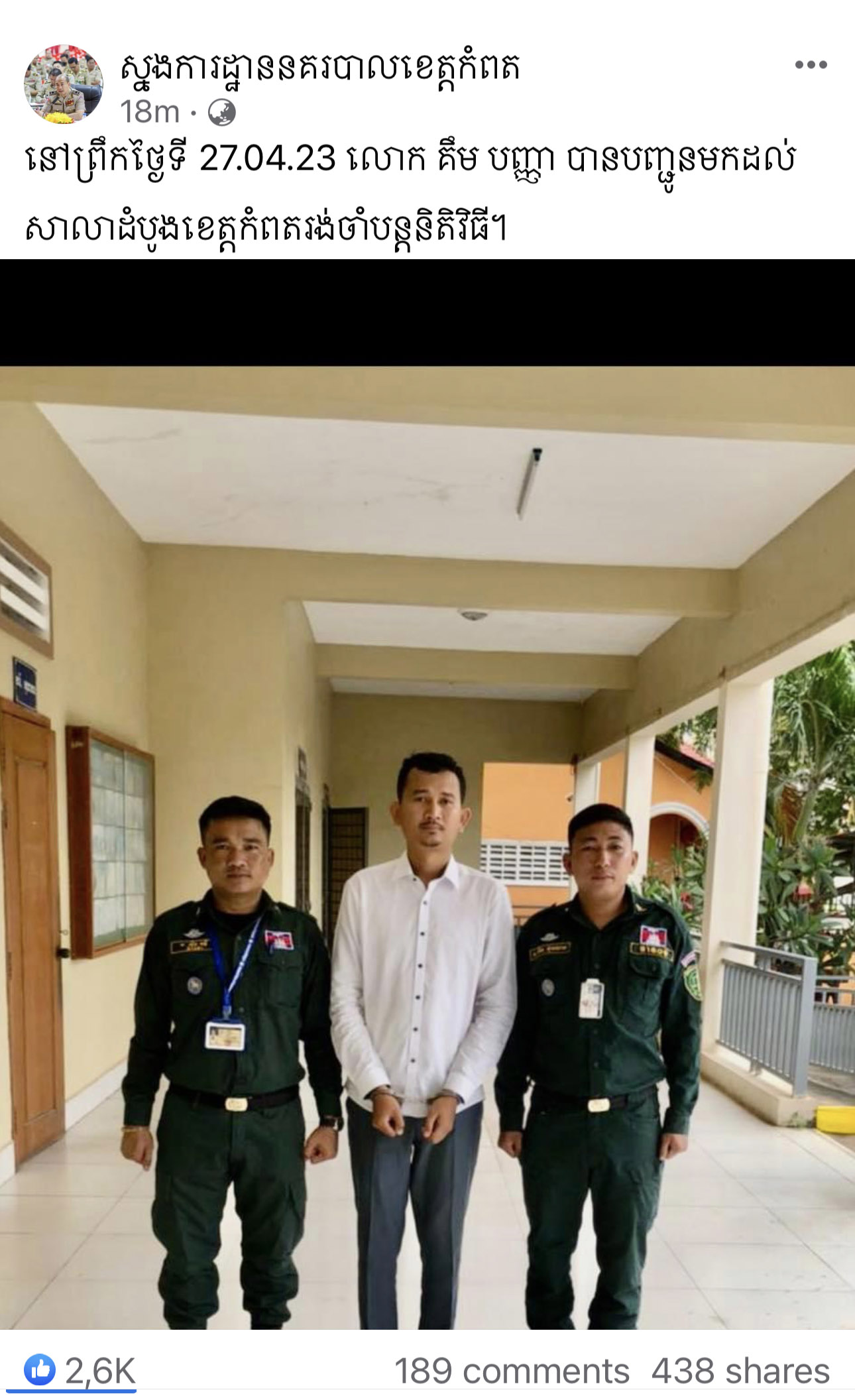 យោងតាមការបញ្ជាក់ពី ស្នងការដ្ឋាននគរបាលខេត្តកំពត បានឲ្យដឹងថា នៅព្រឹកថ្ងៃទី២៧ ខែមេសា ឆ្នាំ២០២៣ នេះ លោក គឹម បញ្ញា ដែលមានតួនាទីជាអភិបាលរងក្រុងបូកគោ ត្រូវបានបញ្ជូនមកដល់សាលាដំបូងខេត្តកំពតហើយ ដើម្បីរង់ចាំបន្តនិតិវិធី។