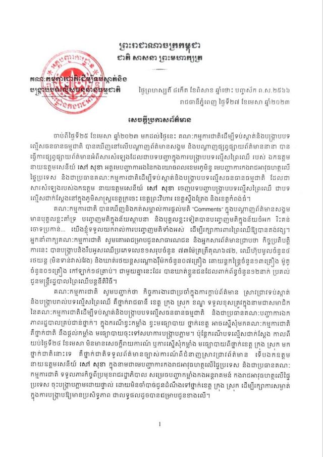 ចាប់ពីថ្ងៃទី២៥ ខែមេសា ឆ្នាំ២០២៣ មកដល់ថ្ងៃនេះ គណៈកម្មការជាតិដើម្បីទប់ស្កាត់និងបង្ក្រាបបទល្មើសធនធានធម្មជាតិ បានឃើញនៅលើបណ្តាញព័ត៌មានសង្គម និងបណ្តាញផ្សព្វផ្សាយព័ត៌មាននានា បានធ្វើការផ្សព្វផ្សាយព័ត៌មានអំពីសារសំឡេងដែលជាបទបញ្ជាក្នុងការបង្ក្រាបបទល្មើសព្រៃឈើ របស់ ឯកឧត្តម នាយឧត្តមសេនីយ៍ សៅ សុខា អគ្គមេបញ្ជាការរងនៃកងយោធពលខេមរភូមិន្ទ មេបញ្ជាការកងរាជអាវុធហត្ថលើផ្ទៃប្រទេស និងជាប្រធានគណៈ កម្មការជាតិដើម្បីទប់ស្កាត់និងបង្ក្រាបបទល្មើសធនធានធម្មជាតិ ដែលជាសារ សំឡេងរបស់ឯកឧត្តម នាយឧត្តមសេនីយ៍ សៅ សុខា ចេញបទបញ្ជាបង្ក្រាបបទល្មើសព្រៃឈើ ជាបទល្មើសជាក់ស្តែងនៅក្នុងភូមិសាស្ត្រខេត្តក្រចេះ ខេត្តព្រះវិហារ ខេត្តស្ទឹងត្រែង និងខេត្តកំពង់ធំ។