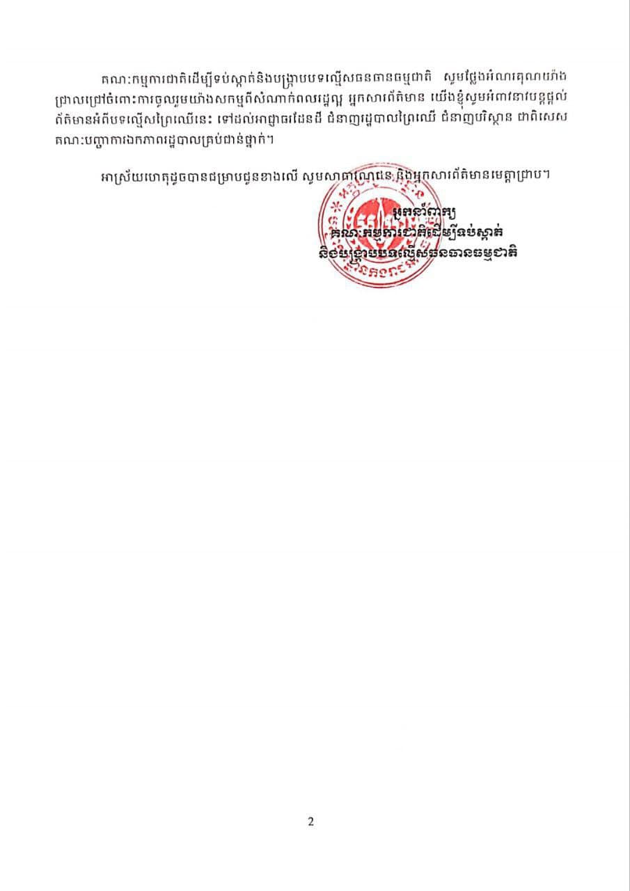 អាស្រ័យហេតុដូចបានជម្រាបជូនខាងលើ សូមសាធារណជន និងអ្នកសារព័ត៌មានមេត្តាជ្រាប ៕