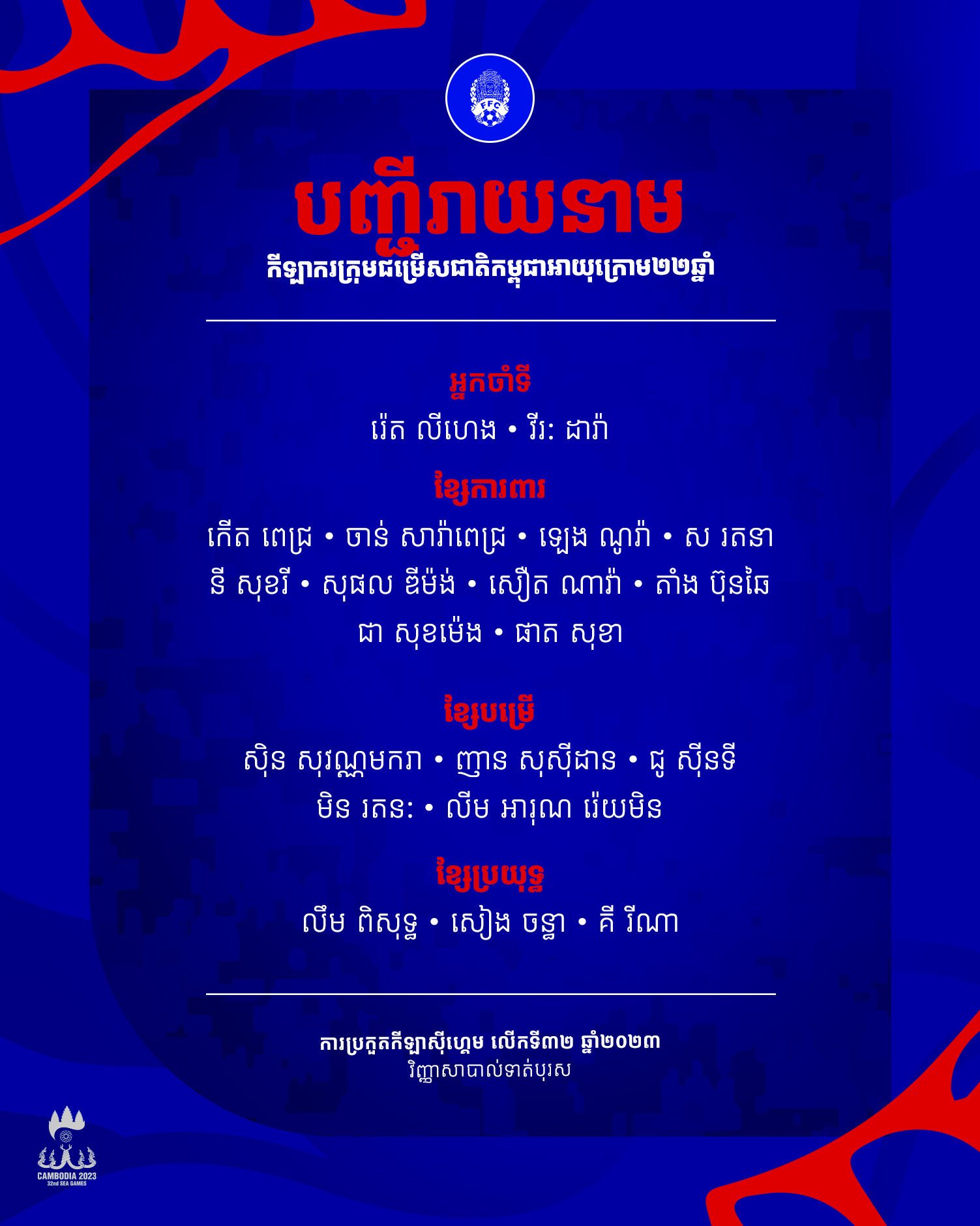 រាជធានីភ្នំពេញ៖ នៅថ្ងៃទី២៨ ខែមេសា ឆ្នាំ២០២៣ យោងតាមការចុះផ្សាយរបស់ សហព័ន្ធកីឡាបាល់ទាត់កម្ពុជា បានបង្ហាញពីបញ្ជីឈ្មោះកីឡាករ ២០នាក់ចុងក្រោយសម្រាប់ការប្រកួតកីឡាសុីហ្គេម លើកទី៣២ ឆ្នាំ២០២៣ វិញ្ញាសាបាល់ទាត់បុរស។
