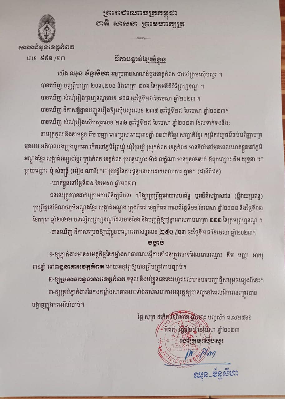 យោងតាមដីការបង្គាប់ឱ្យឃាត់ខ្លួនរបស់ សាលាដំបូងខេត្តកំពត ចុះថ្ងៃទី២៨ ខែមេសា ឆ្នាំ២០២៣ បានបញ្ជាក់ថា ជនត្រូវចោទឈ្មោះ គឹម បញ្ញា ត្រូវបានចោទប្រកាន់ពីបទ «ហិង្សាប្រព្រឹត្តដោយសហព័ទ្ធ ឬអនីតិសង្វាក់ជន (ប្ដីវាយប្រពន្ធ)» ប្រព្រឹត្តនៅចំណុចភូមិអណ្ដូងខ្មែរ សង្កាត់អណ្ដូង ក្រុងកំពត ខេត្តកំពត កាលពីថ្ងៃទី១១ ខែមេសា ឆ្នាំ២០២២ និងថ្ងៃទី១២ ខែកក្កដា ឆ្នាំ២០២២។