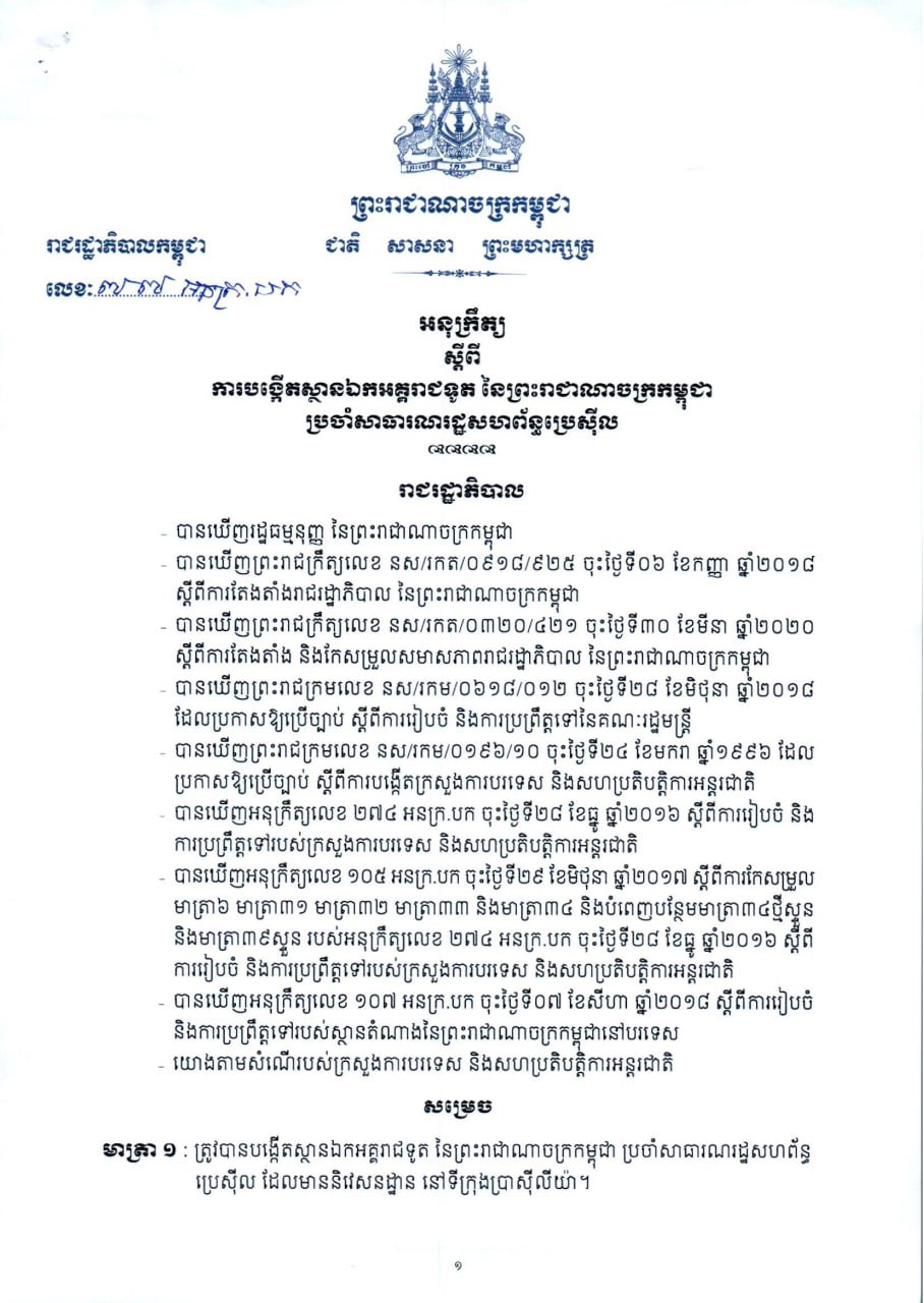 រាជរដ្ឋាភិបាលកម្ពុជា សម្រេចបង្កើតស្ថានឯកអគ្គរាជទូត នៃព្រះរាជាណាចក្រកម្ពុជា ប្រចាំសាធារណរដ្ឋសហព័ន្ធ ប្រេស៊ីល ដែលមាននិវេសនដ្ឋាន នៅទីក្រុងប្រាស៊ីលីយ៉ា។