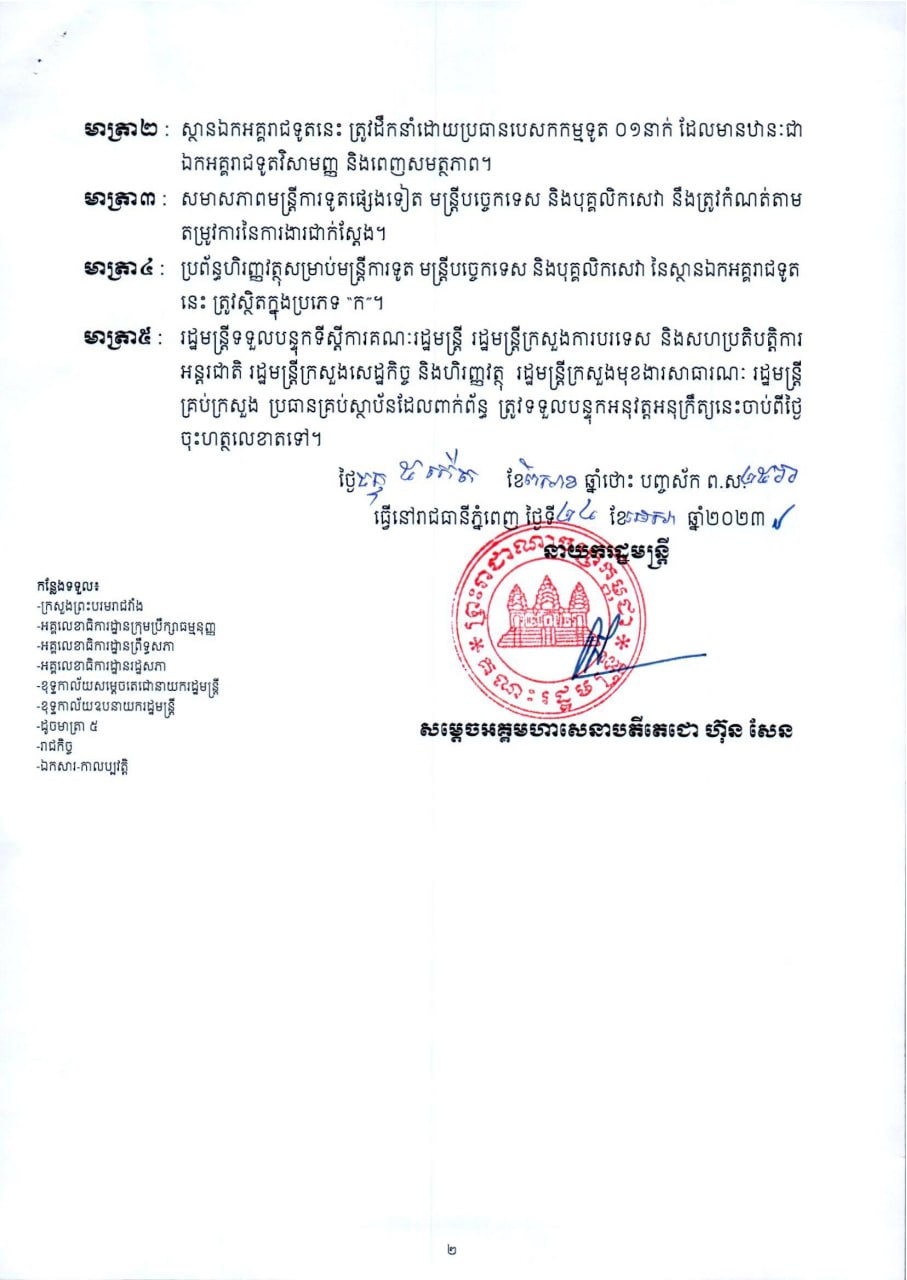 មាត្រា២៖ ស្ថានឯកអគ្គរាជទូតនេះ ត្រូវដឹកនាំដោយប្រធានបេសកកម្មទូត ០១នាក់ ដែលមានឋានៈជា ឯកអគ្គរាជទូតវិសាមញ្ញ និងពេញសមត្ថភាព។