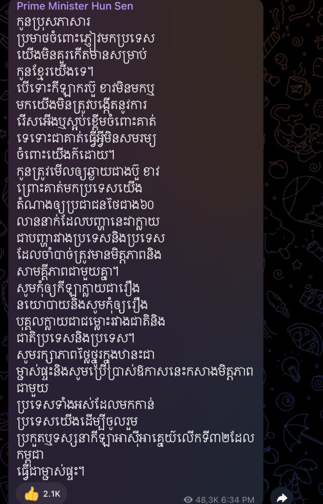 សម្ដេចបានលើកឡើងទៀតថា «សូមកុំឲ្យកីឡាក្លាយជារឿងនយោបាយ និងសូមកុំឲ្យរឿងបុគ្គលក្លាយជាជម្លោះរវាងជាតិនិងជាតិ ប្រទេសនិងប្រទេស។ សូមរក្សាភាពថ្លៃថ្នូរក្នុងឋានៈជាម្ចាស់ផ្ទះ និងសូមប្រើប្រាស់ឱកាសនេះកសាងមិត្តភាពជាមួយប្រទេសទាំងអស់ដែលមកកាន់ប្រទេសយើង ដើម្បីចូលរួមប្រកួត ឬទស្សនាកីឡាអាស៉ីអាគ្នេយ៍លើកទី៣២ ដែលកម្ពុជាធ្វើជាម្ចាស់ផ្ទះ»៕