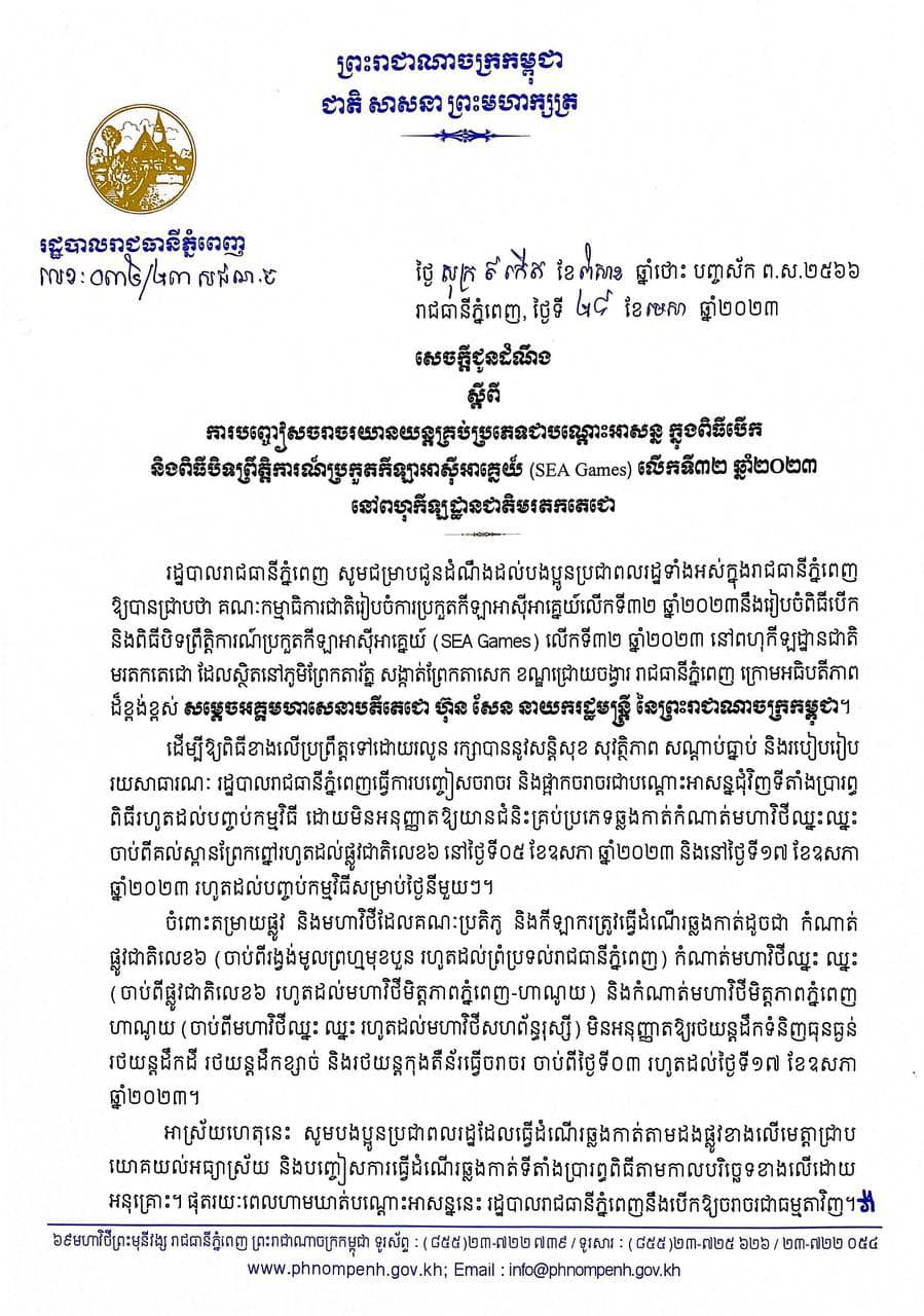 រាជធានីភ្នំពេញ៖ នៅថ្ងៃទី២៨ ខែមេសា ឆ្នាំ២០២៣ យោងតាមការចុះផ្សាយរបស់ រដ្ឋបាលរាជធានីភ្នំពេញ បានចេញសេចក្តីជូនដំណឹង ស្តីពីការបញ្ចៀសចរាចរយានយន្តគ្រប់ប្រភេទជាបណ្តោះអាសន្ន ក្នុងពិធីបើក និងពិធីបិទព្រឹត្តិការណ៍ប្រកួតកីឡាអាស៊ីអាគ្នេយ៍ (SEA Games) លើកទី៣២ ឆ្នាំ២០២៣ នៅពហុកីឡដ្ឋានជាតិមរតកតេជោ។