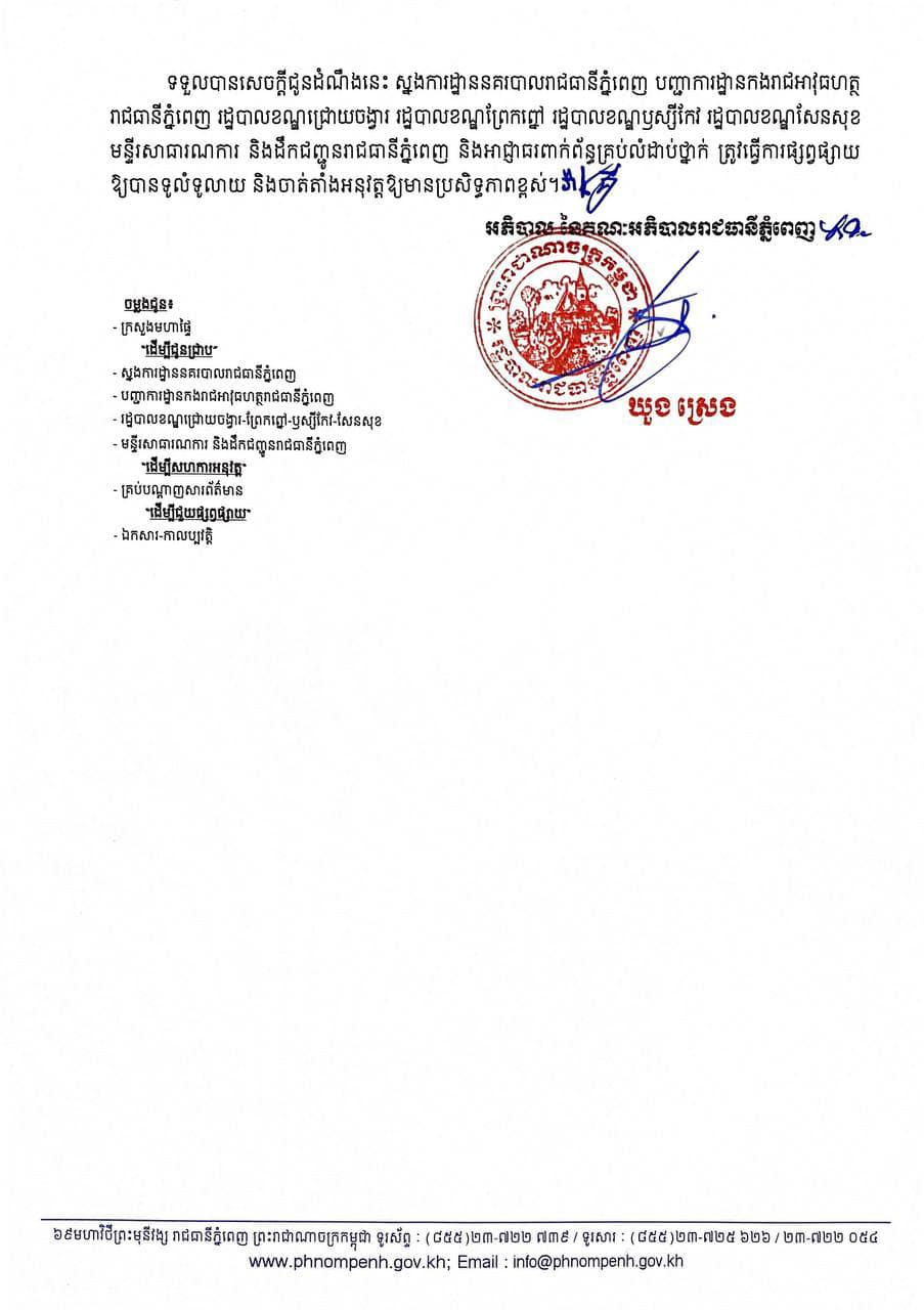 អាស្រ័យហេតុនេះ សូមបងប្អូនប្រជាពលរដ្ឋដែលធ្វើដំណើរឆ្លងកាត់តាមដងផ្លូវខាងលើមេត្តាជ្រាប យោគយល់អធ្យាស្រ័យ និងបញ្ចៀសការធ្វើដំណើរឆ្លងកាត់ទីតាំងប្រារព្ធពិធីតាមកាលបរិច្ឆេទខាងលើដោយ អនុគ្រោះ។ ផុតរយៈពេលហាមឃាត់បណ្តោះអាសន្ននេះ រដ្ឋបាលរាជធានីភ្នំពេញនឹងបើកឱ្យចរាចរជាធម្មតាវិញ ៕