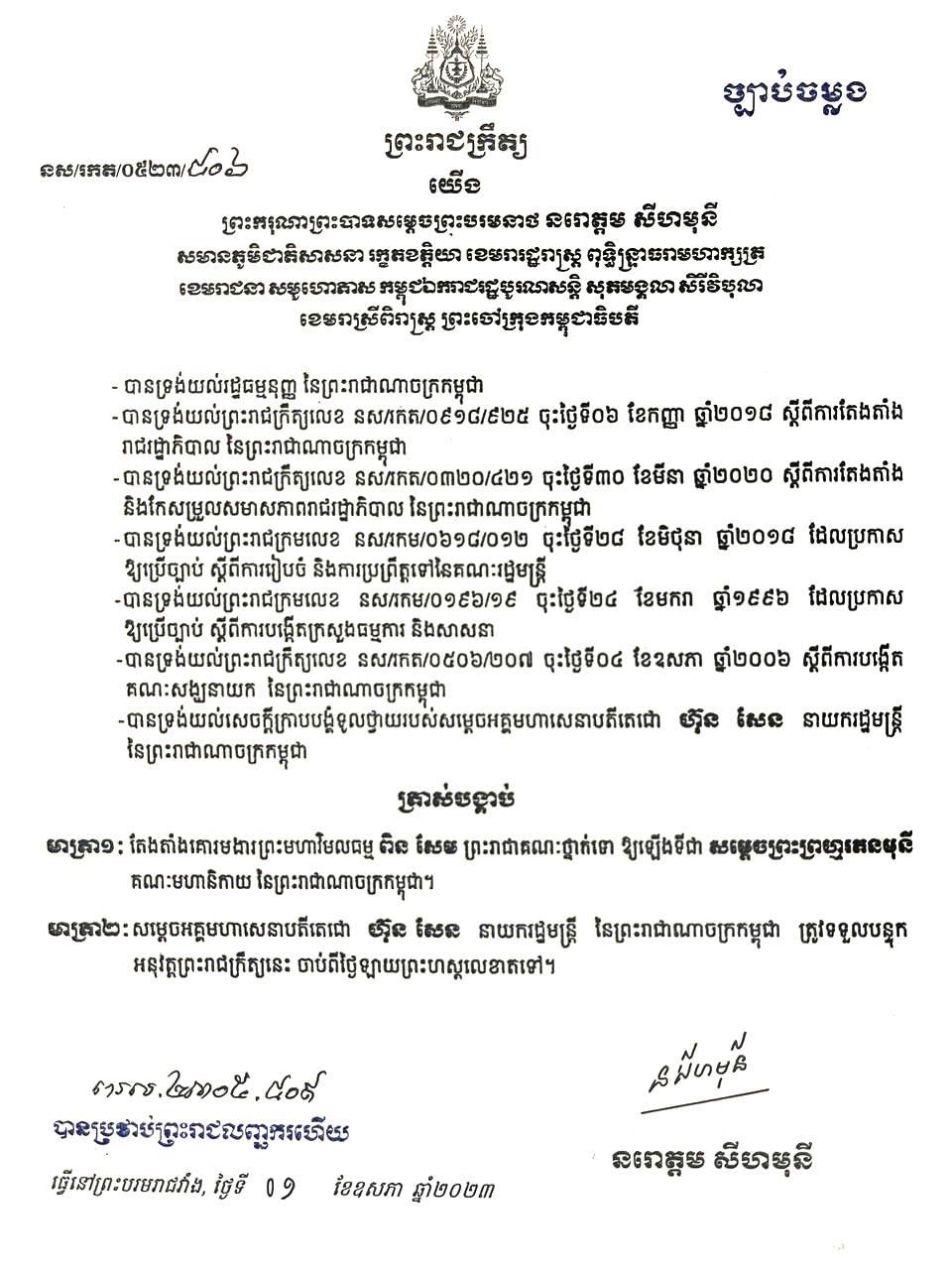ព្រះមហាក្សត្រ តែងតាំងគោរមងារ ព្រះមហាវិមលធម្ម ពិន សែម ឱ្យឡើងជា «សម្តេចព្រះព្រហ្មរតនមុនី គណៈមហានិកាយ នៃព្រះរាជាណាចក្រកម្ពុជា