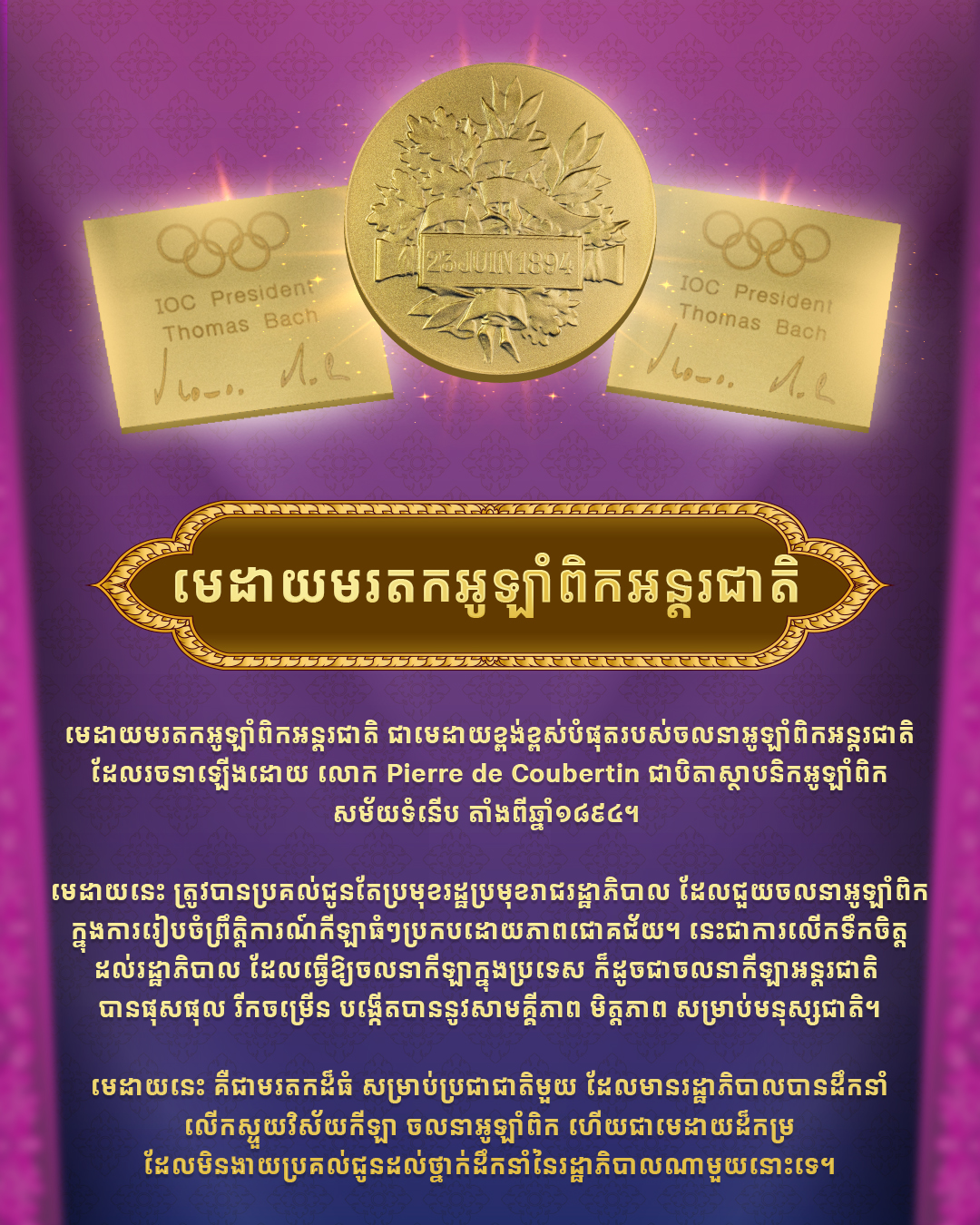 សូមអបអរសាទរ ជូនដល់សម្តេចអគ្គមហាសេនាបតីតេជោ ហ៊ុន សែន នាយករដ្ឋមន្ត្រីនៃព្រះរាជាណាចក្រកម្ពុជា ដែលបានទទួលមេដាយមរតកអូឡាំពិកអន្តរជាតិ ឬហៅថា Pierre de Coubertin Medal ដែលជាមេដាយខ្ពស់បំផុតរបស់គណៈកម្មាធិការអូឡាំពិកអន្តរជាតិ (IOC)។ មេដាយនេះ ត្រូវបានរចនាដោយលោក Pierre de Coubertin ដែលជាបិតាស្ថាបនិកអូឡាំពិកសម័យទំនើប តាំងតែពីឆ្នាំ១៨៩៤។ IOC បានផ្ដល់ជូនមេដាយនេះ នៅក្នុងពិធីបើកព្រឹត្តិការណ៍ស៊ីហ្គេម លើកទី៣២ ឆ្នាំ២០២៣ នៅពហុកីឡដ្ឋានជាតិមរតកតេជោ នៅថ្ងៃសុក្រ ទី០៥ ខែឧសភា នេះផ្ទាល់។