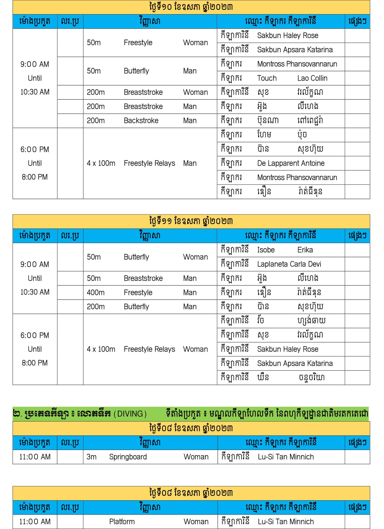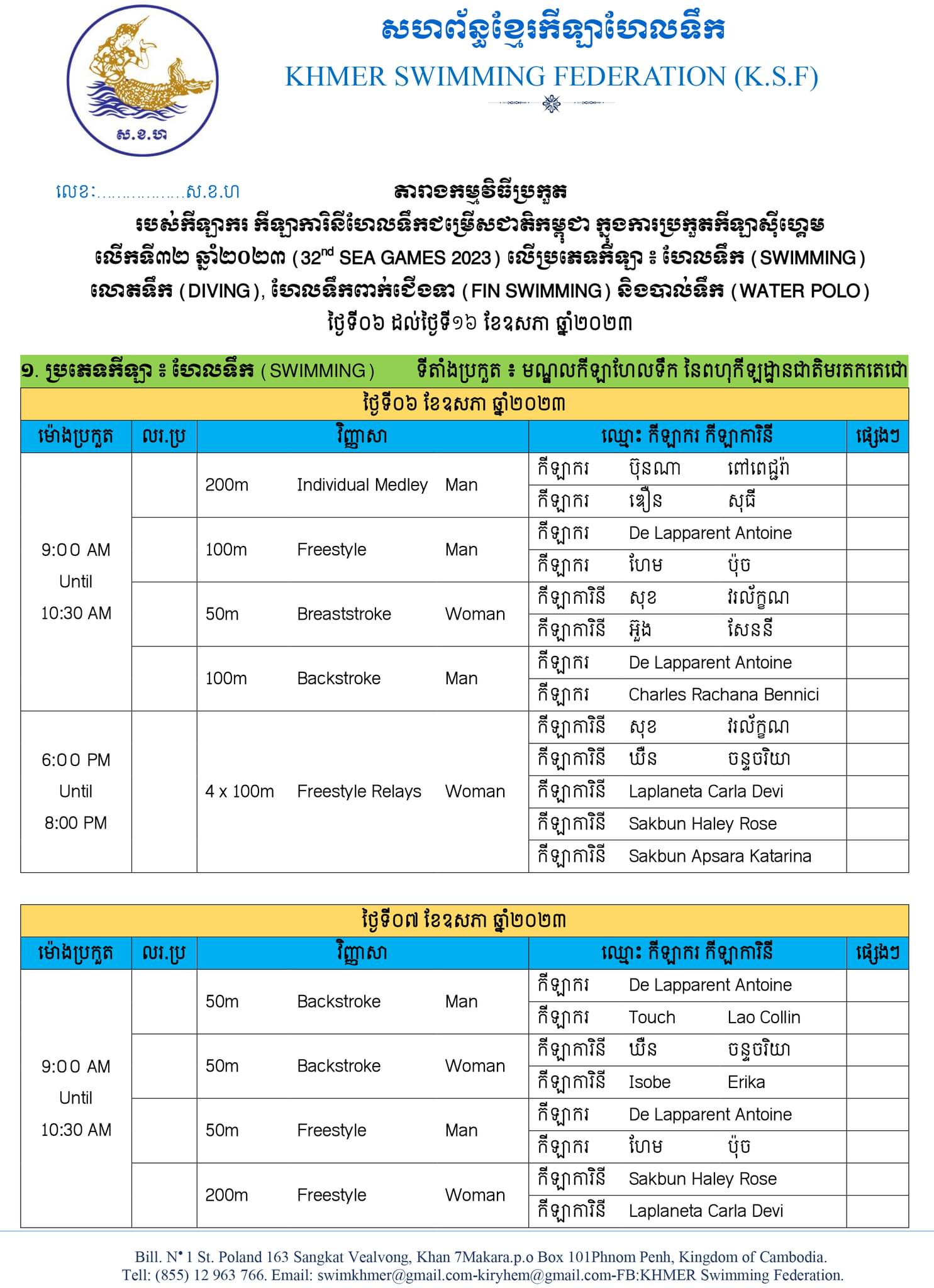 មកដឹងពីកាលវិភាគ ទីតាំង វិញ្ញាសា កីឡាហែលទឹកជម្រើសជាតិកម្ពុជា ចាប់ពីថ្ងៃនេះ ដល់ថ្ងៃទី១៦ ខែឧសភា ចំពោះសំបុត្រចែកជូនដោយឥតគិតថ្លៃ