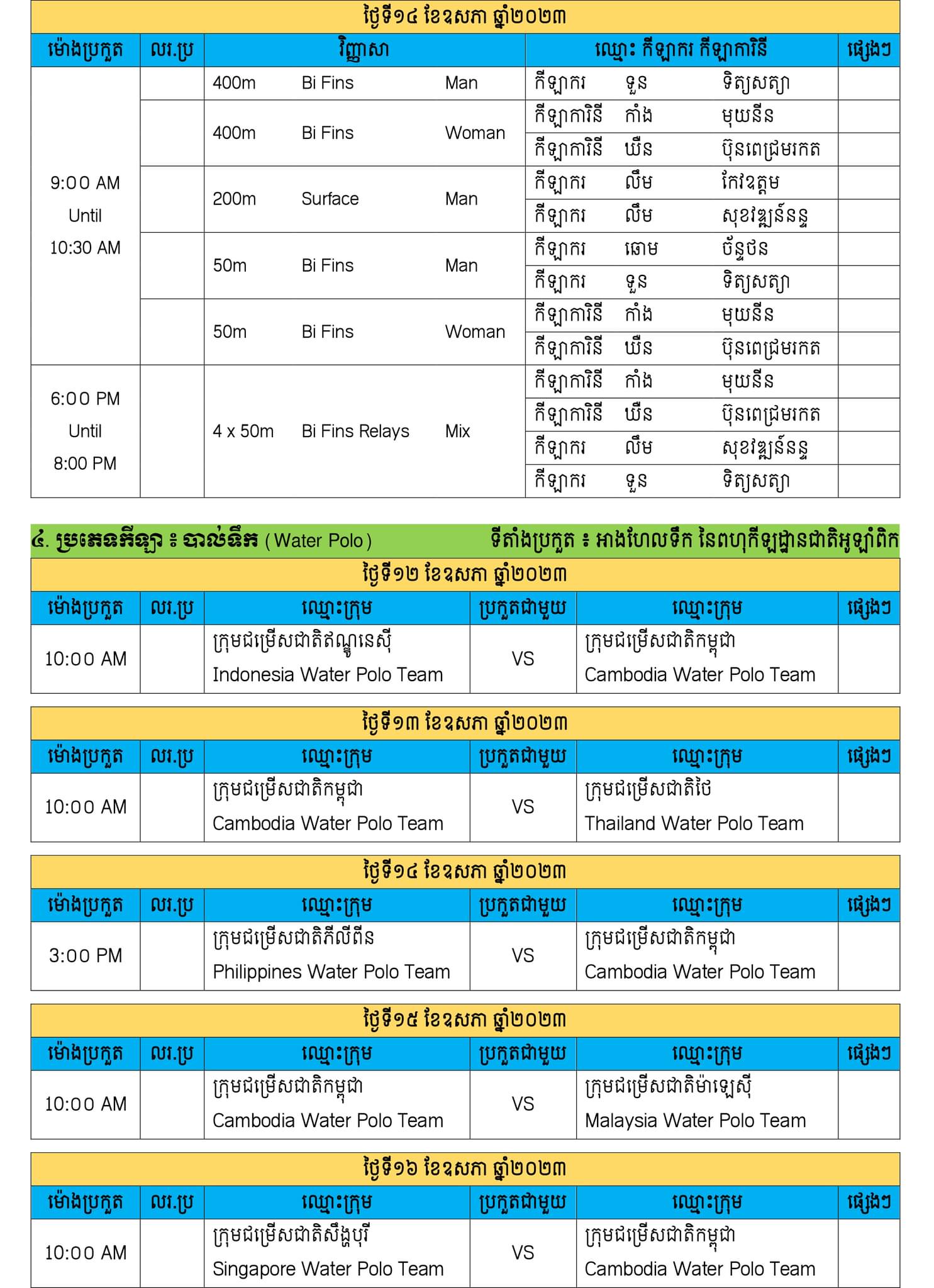 ចំពោះ កាលវិភាគ ទីតាំង វិញ្ញាសា និង បេក្ខភាព មានដូចក្នុងតារាងខាងក្រោម សូមចូលរួមផ្តល់កម្លាំងចិត្តឱ្យបានកុះករ។ សំបុត្រមានចែកជូនដោយឥតគិតថ្លៃ នៅច្រកចូលទីតាំងប្រកួត៕