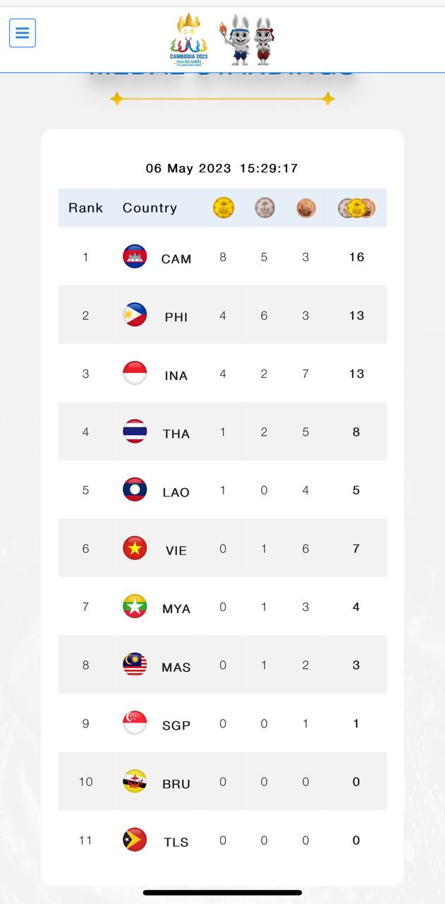 រាជធានីភ្នំពេញ៖ នៅថ្ងៃទី០៦ ខែឧសភា ឆ្នាំ២០២៣ យោងតាមលទ្ធផលរបស់ SeaGames 2023 បានបង្ហាញឱ្យដឹងថា កម្ពុជាបន្ដឈរ នៅលេខ១ ក្នុងនាមជាអ្នកឈ្នះមេដាយមាសច្រើនជាងគេ នៅស៊ីហ្គេម២០២៣នេះ (គិតត្រឹមម៉ោង៣៖២៦នាទីរសៀល ថ្ងៃទី០៦ ខែឧសភា ឆ្នាំ២០២៣)។
