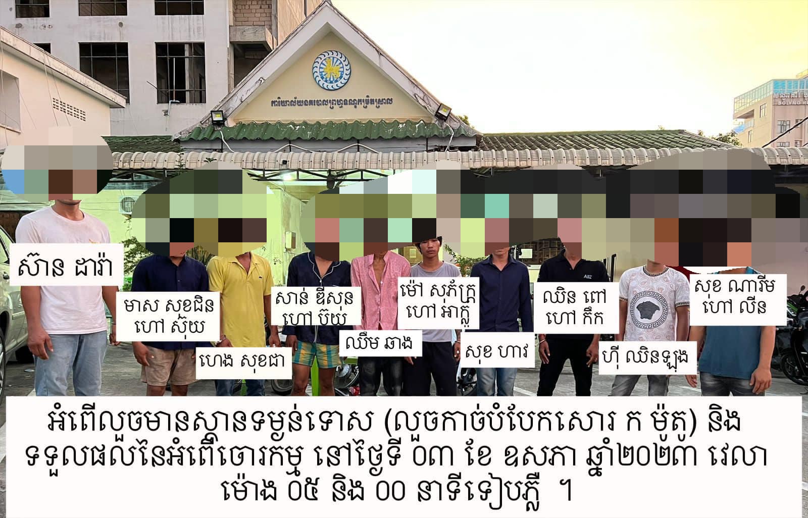 ខេត្តព្រះសីហនុ៖ នៅថ្ងៃទី០៨ ខែឧសភា ឆ្នាំ២០២៣ ស្នងការនគរបាលខេត្តព្រះសីហនុ បានឲ្យដឹងថា នៅព្រឹកថ្ងៃ៨ ខែឧសភា ឆ្នាំ២០២៣ថា នគរបាលជំនាញបង្ក្រាបនិងឃាត់ខ្លួនជនសង្ស័យចំនួន ១៣នាក់ ដែលលួចប្លន់ដោយធ្វើសកម្មភាពប្រើដាវកាប់ប្លន់យកម៉ូតូ ,លួចកាច់បំបែកសោកម៉ូតូ និង កាច់បំបែកសោលួចរថយន្ត ,អ្នកទទួលផលចោរកម្ម ,កាន់កាប់រក្សាទុកប្រើប្រាស់អាវុធខុសច្បាប់ និង រក្សាទុកដោយខុសច្បាប់នូវសារធាតុញៀន។
