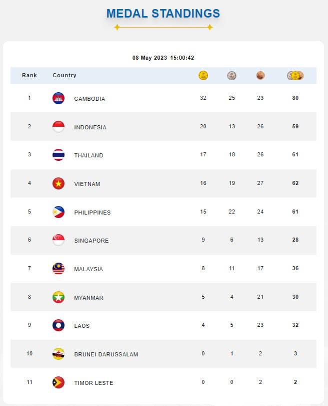 រាជធានីភ្នំពេញ៖ យោងតាមលទ្ធផលរបស់ SeaGames 2023 បានបង្ហាញឱ្យដឹងថា បច្ចុប្បន្នភាព កម្ពុជាបន្តឈរលេខរៀងទី១ ក្នុងនាមជាអ្នកឈ្នះមេដាយមាសច្រើនជាងគេ នៅស៊ីហ្គេម២០២៣ (គិតត្រឹមម៉ោង ១៥៖០០ នៅថ្ងៃទី០៨ ខែឧសភា ឆ្នាំ២០២៣)។