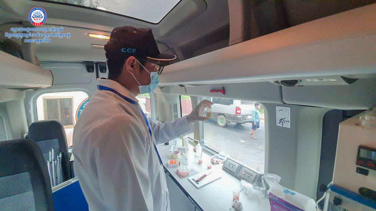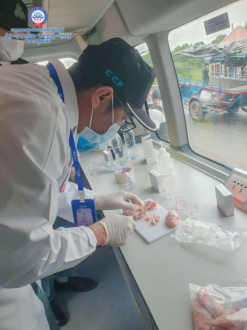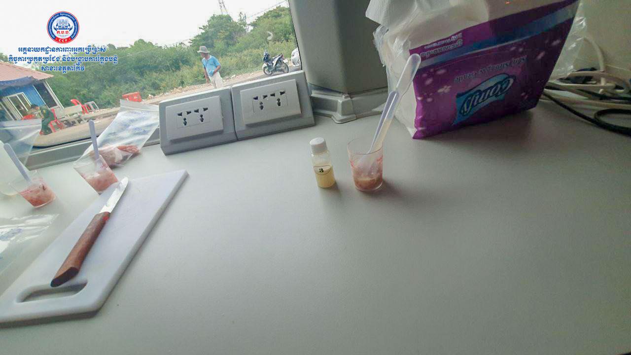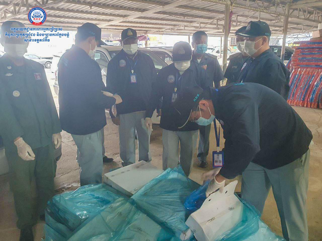 ខេត្តតាកែវ៖ នៅថ្ងៃទី០៨ ខែឧសភា ឆ្នាំ២០២៣ មន្រ្តីជំនាញ ក.ប.ប. សាខាខេត្តតាកែវ និងដោយមានកិច្ចសហការជាមួយមន្រ្តីជំនាញ គយនិងរដ្ឋាករច្រកទ្វារភ្នំដិន និងអមដំណើរដោយរថយន្តមន្ទីរពិសោធន៍ចល័តម្ហូបអាហារបានចុះត្រួតពិនិត្យទៅលើសាច់មាន់បង្កកដែលនាំចូលមកពីបរទេសតាមច្រកទ្វាភ្នំដិនចំនួន ៥០កេស ដែលក្នុង ១កេសមានទម្ងន់ ៥០គីឡូក្រាម។