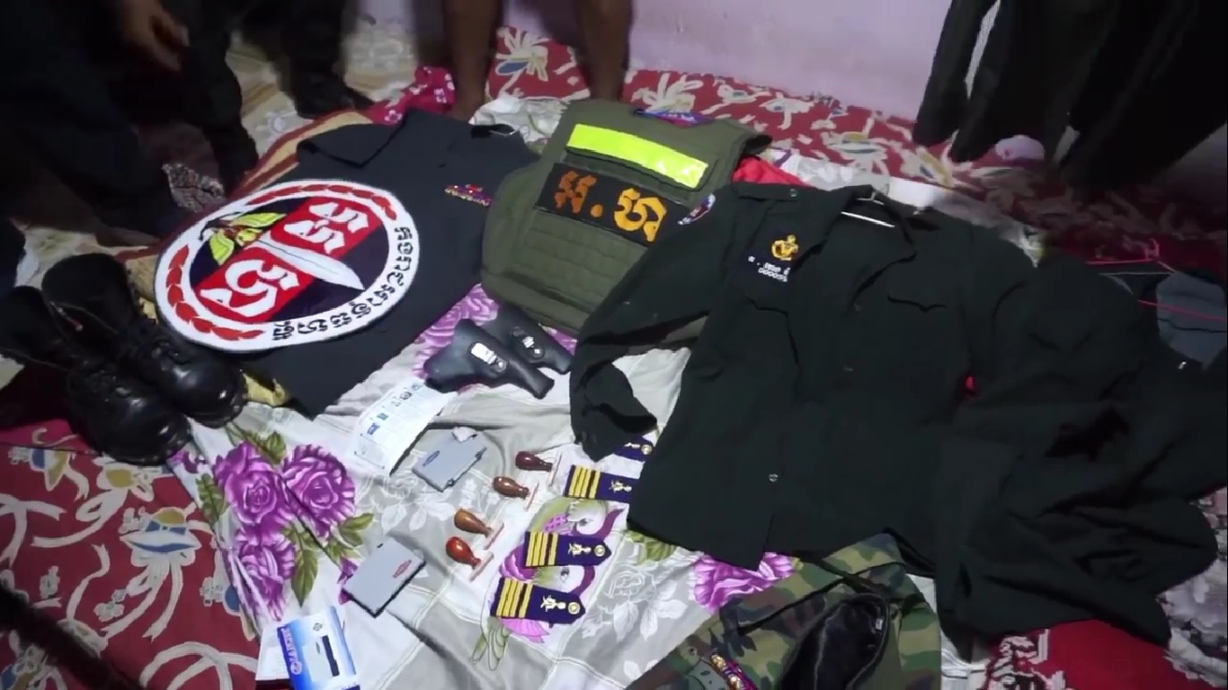 ជនសង្ស័យឈ្មោះ ពេជ្រ និវត្តន៍ ភេទប្រុស អាយុ៣៨ ជាជនស៊ីវិល មានមុខរបបមិនពិតប្រាកដ បានសារភាពថាខ្លួន ពិតជាបានក្លែងបន្លំឯកសណ្ឋាន កងរាជអាវុធហត្ថ និងយោធា ដើម្បីធ្វើសកម្មភាព ឃាត់ប្រជាពលរដ្ឋតាមផ្លូវ ឆែករកគ្រឿងញៀន និង គំរាមកំហែងជម្រិតទារប្រាក់ ពិតប្រាកដមែន ដោយធ្វើសកម្មភាពជាមួយ បក្ខពួកម្នាក់ទៀត ឈ្មោះ កី បច្ចុប្បន្នបានគេចខ្លួនបាត់ទៅហើយ ព្រមជាមួយគ្នានោះ សមត្ថកិច្ចអាវុធហត្ថ ក៏បានចាប់យកវត្ថុតាងជាច្រើនរួមមាន៖ ឯកសណ្ឋានយោធាប៉ារ៉ា ០១កំប្លេ, ឯកសណ្ឋានអាវុធហត្ថ ០២កំប្លេ, អាវកាក់អាវុធហត្ថ ០១, ស្លាកលោហ្គោអាវុធហត្ថ ០១, ស្បែកជើងកវែង ០១គូ, ស្រោមកាំភ្លើង ០២, ស័ក្កិស្មា ០២គូ, មួកប៉េរ៉េ ០២, ត្រាឈ្មោះ ០៤, តាំប៉ុង០២, រូបថតតូចធំ ០២សន្លឹក, មេដាយ ០១, កាបូបប៉ារ៉ា ០១, ម៉ូតូចំនួន០១គ្រឿងម៉ាក ណៃហត ពណ៌ខ្មៅ ពាក់ស្លាកលេខ កម្ពុជា ០.០០០០, ទូរស័ព្ទដៃ ០២គ្រឿង, និងស្លាក កងរាជអាវុហត្ថ ០១ផ្ទាំង ផងដែរ។