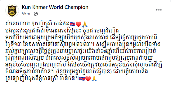 ក្នុងសំនេរលោក ឧកញ៉ាស្រី ចាន់ថន បានសរសេររៀបរាប់ថា៖ «បងប្អូនជនរួមជាតិជាទីគោរពនៅថ្ងៃនេះ ប៊ួខាវ ចេញដំណើរមកហើយមកជាមួយក្រុមកីឡាឃីកបុកស៊ីងរបស់គាត់ ដើម្បីធ្វើការប្រកួតចាប់ពីថ្ងៃទី១៣ ខែឧសភាតទៅនៅស៊ីហ្គេម២០២៣។ សង្ឃឹមថាបងប្អូនកម្ពុជាយើងទាំងអស់គ្នារក្សាសេចក្ដីថ្លៃថ្នូរក្នុងនាមម្ចាស់ផ្ទះយើងចាំ៦៤ឆ្នាំហើយ សម្រាប់ការរៀបចំព្រឹត្តិការណ៍ស៊ីហ្គេម ជាពិសេសខ្ញុំសំណូមពរតាមផេកកុំបង្ហោះរូបភាពជាមួយអត្ថន័យបែបញុះញង់បញ្ឆេះកំហឹងថែមយើងត្រូវយល់ពីអត្ថន័យនៃស៊ីហ្គេមគឺដើម្បីចំណងមិត្តភាពអាស៊ាន។ (ខ្មែររូបរួមគ្នាខ្មែរអាចធ្វើបាន) ដោយក្ដីគោរពនិងស្រឡាញ់បំផុតពីខ្ញុំបាទស្រី ចាន់ថន» ៕