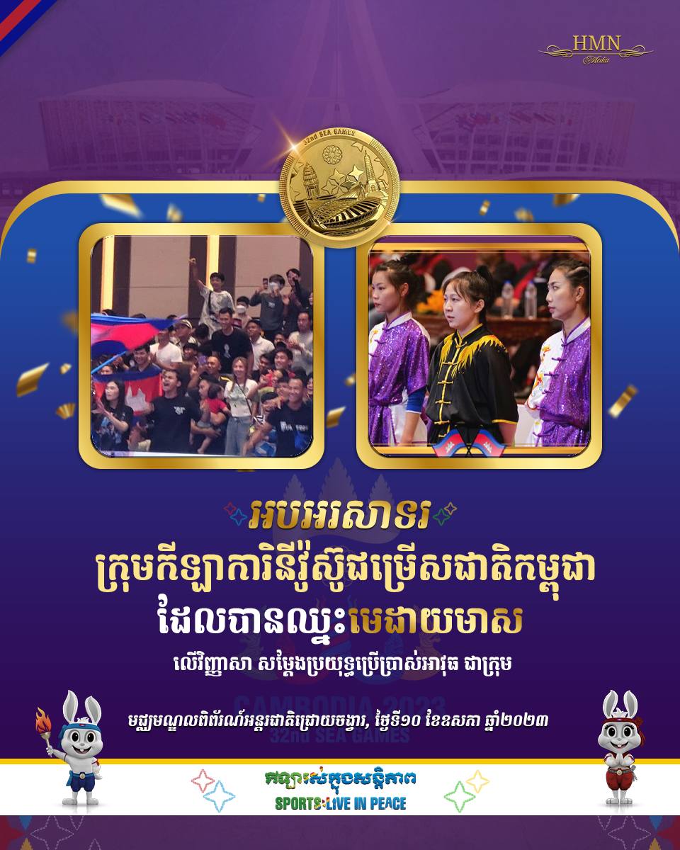 អបអរសាទរ! ក្រុមកីឡាការិនីវ៉ូស៊ូជម្រើសជាតិកម្ពុជា ឈ្នះមេដាយមាស លើវិញ្ញាសា សម្ដែងប្រយុទ្ធប្រើប្រាស់អាវុធ ជាក្រុម