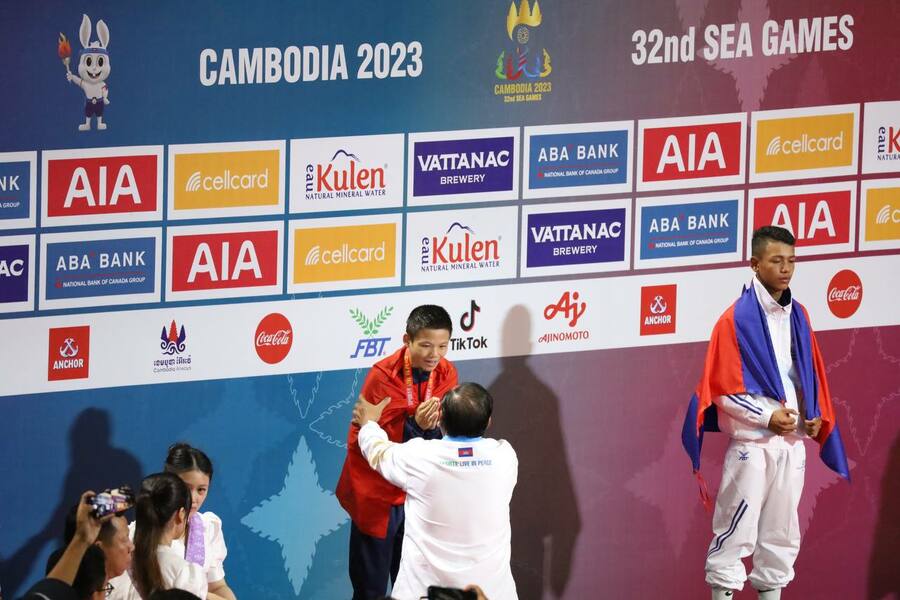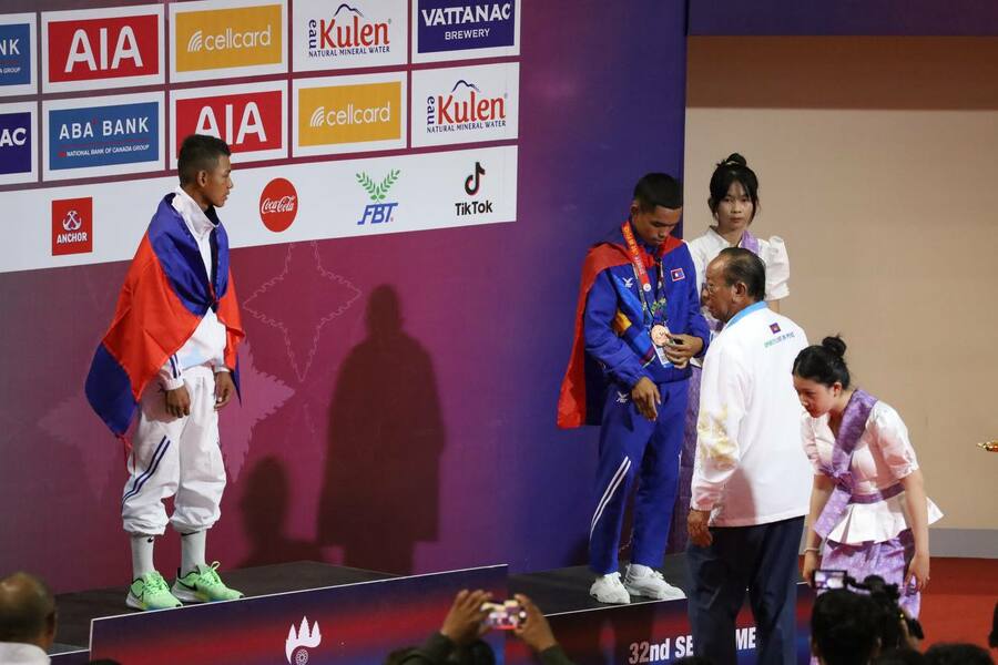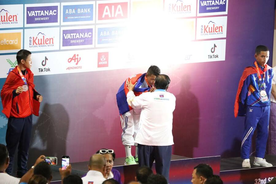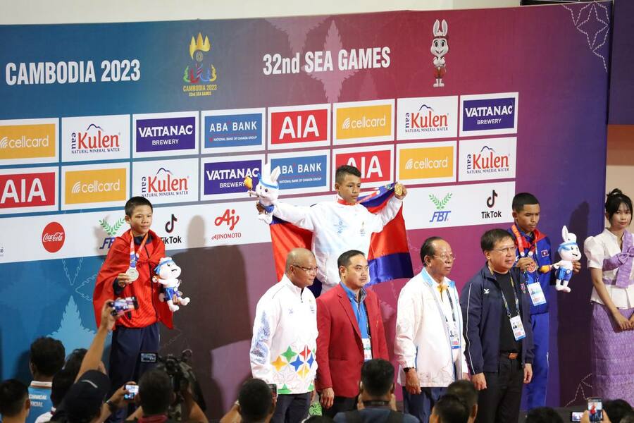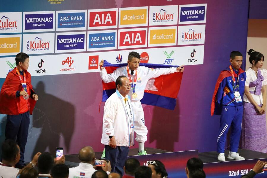 រាជធានីភ្នំពេញ៖ យោងតាមការចុះផ្សាយរបស់ ក្រសួងព័ត៌មាន បានឱ្យដឹងថា សម្តេចពិជ័យសេនា ទៀ បាញ់ ឧបនាយករដ្ឋមន្រ្តី រដ្ឋមន្រ្តីក្រសួងការពារជាតិ និងជាប្រធានគណៈកម្មាធិការជាតិរៀបចំការប្រកួតកីឡាអាស៊ីអាគ្នេយ៍ លើកទី៣២ និងអាស៊ានប៉ារ៉ាហ្គេម លើកទី១២ អញ្ជើញបំពាក់មេដាយមាសដល់កីឡាករគុនខ្មែរ ម៉ាប់ ធារ៉ា និងកីឡាករជ័យលាភីលេខ២ និងលេខ៣ សម្រាប់វិញ្ញាសាគុនខ្មែរបុរស ក្នុងប្រភេទទម្ងន់ ៤៥គីឡូក្រាម នារសៀលថ្ងៃទី១០ ខែឧសភា ឆ្នាំ២០២៣ នៅពហុកីឡដ្ឋានជាតិមរតកតេជោ ៕