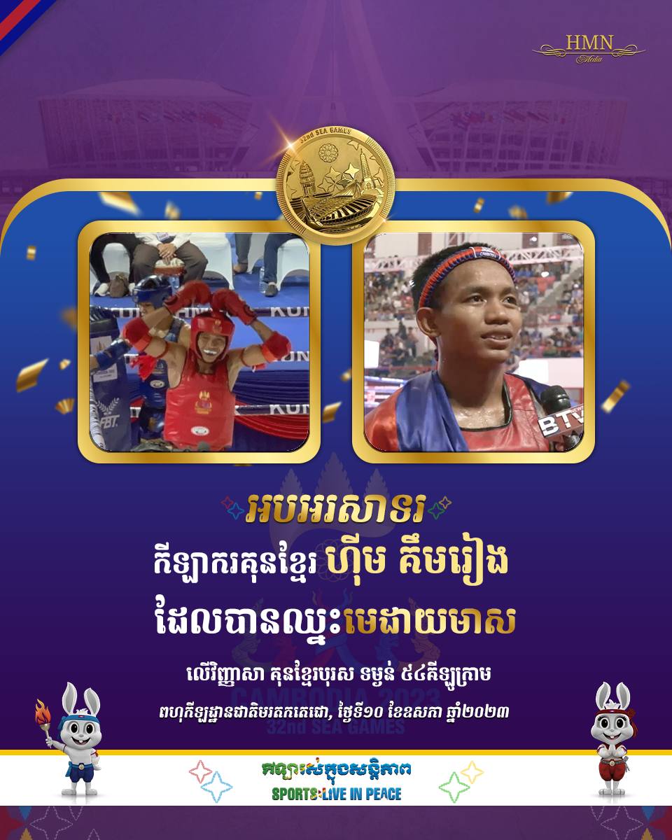 រាជធានីភ្នំពេញ៖ នារសៀលថ្ងៃទី១០ ខែឧសភា ឆ្នាំ២០២៣ កីឡាករគុនខ្មែរ ហ៊ីម គឹមរៀង បានឈ្នះមេដាយមាស លើវិញ្ញាសាគុនខ្មែរបុរស ក្នុងប្រភេទទម្ងន់ ៥៤គីឡូក្រាម បន្ទាប់ពីបានយកឈ្នះកីឡាករឡាវ នៃព្រឹត្តិការណ៍កីឡាស៊ីហ្គេម នៅពហុកីឡដ្ឋានជាតិមរតកតេជោ។