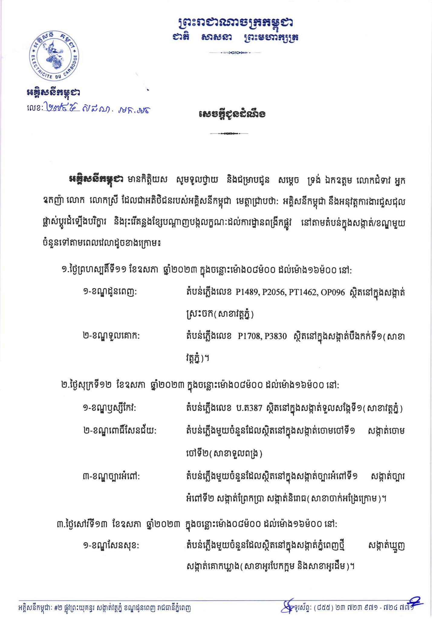 សាកថ្មឱ្យពេញៗ! ចាប់ពីថ្ងៃនេះ ដល់ថ្ងៃទី១៤ ខែឧសភា អគ្គិសនីកម្ពុជានឹងផ្អាកចរន្តអគ្គិសនីនៅតំបន់មួយចំនួន តាមបណ្ដាខណ្ឌ និងក្រុងទាំងនេះ