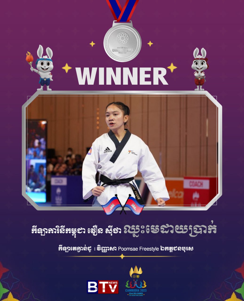 រាជធានីភ្នំពេញ៖ នៅថ្ងៃទី១២ ខែឧសភា ឆ្នាំ២០២៣ កីឡាការិនី វឿន ស៊ីថា ដែលទទួលបានមេដាយប្រាក់ លើប្រភេទកីឡាតេក្វាន់ដូ វិញ្ញាសា Poomsae Freestyle ឯកត្តជននារី ក្នុងព្រឹត្ដិការណ៍កីឡាស៊ីហ្គេម លើកទី៣២ ឆ្នាំ២០២៣ ដែលប្រារព្ធធ្វើឡើងនៅ នៅមណ្ឌលសន្និបាត និងពិព័រណ៍អន្ដរជាតិជ្រោយចង្វារ OCIC អគារ F ៕