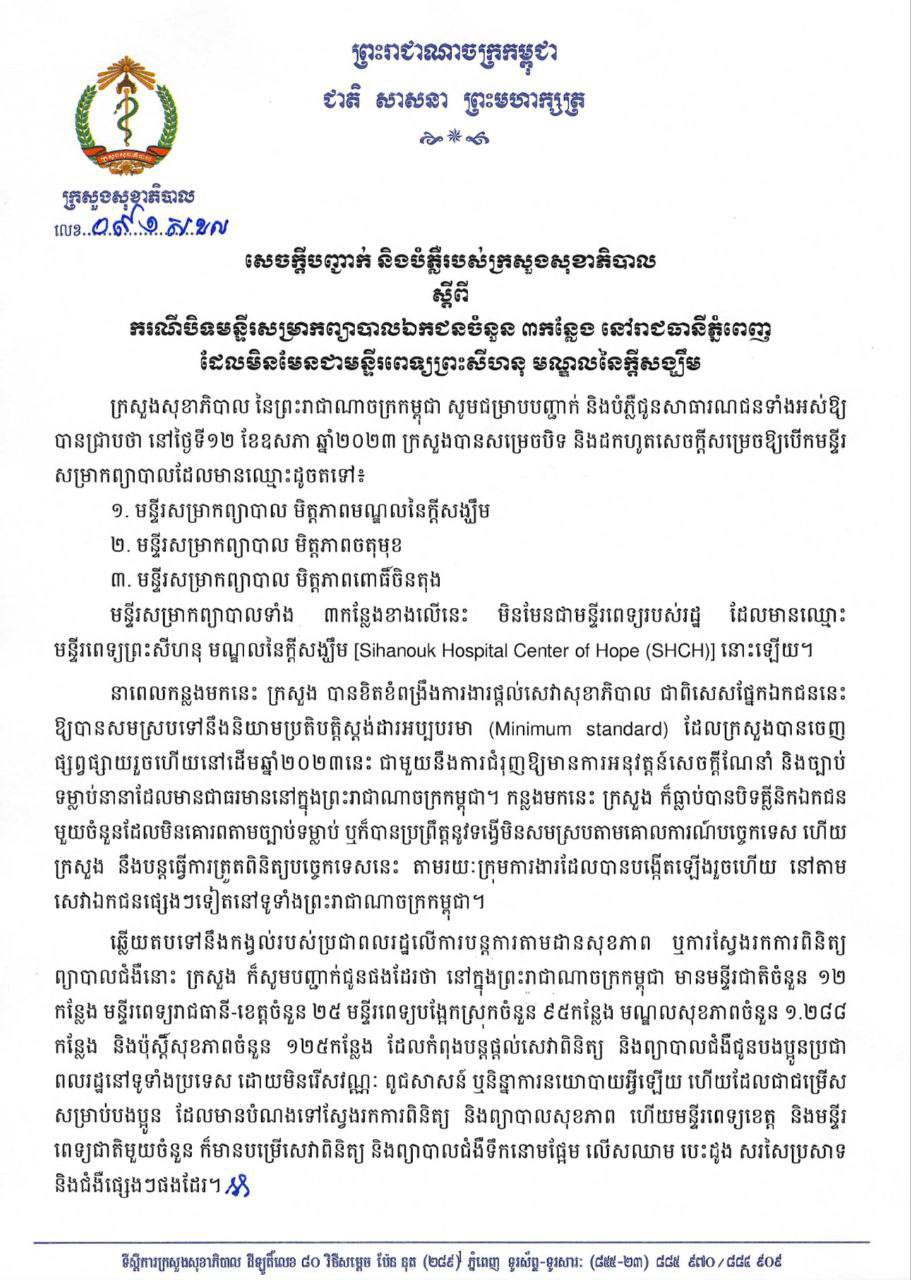 ក្រសួងសុខាភិបាលសូមជម្រាបបញ្ជាក់ និងបំភ្លឺជូនសាធារណជនទាំងអស់ឱ្យបានជ្រាបថា នៅថ្ងៃទី១២ ខែឧសភា ឆ្នាំ២០២៣ ក្រសួងបានសម្រេចបិទ និងដកហូតសេចក្តីសម្រេចឱ្យបើកមន្ទីរ សម្រាកព្យាបាលដែលមានឈ្មោះដូចតទៅ៖