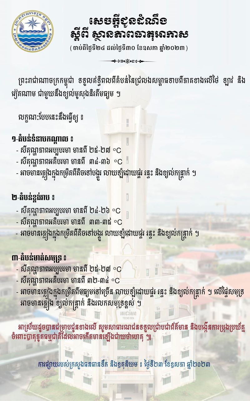 រាជធានីភ្នំពេញ៖ នៅថ្ងៃទី២៣ ខែឧសភា ឆ្នាំ២០២៣ យោងតាមការចុះផ្សាយរបស់ ក្រសួងធនធានទឹក និងឧតុនិយម បានចេញសេចក្ដីជូនដំណឹង ស្ដីពី ស្ថានភាពធាតុអាកាស ចាប់ពីថ្ងៃទី២៤ ដល់ថ្ងៃទី៣០ ខែឧសភា ឆ្នាំ២០២៣។