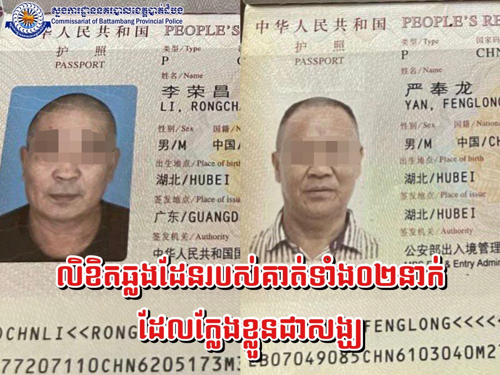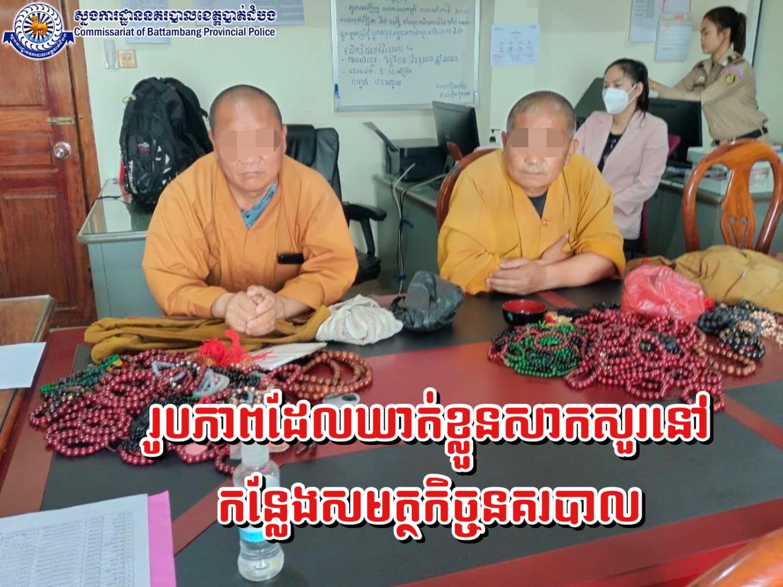 ដល់ថ្ងៃទី២៣ ខែឧសភា ឆ្នាំ២០២៣ នេះសមត្ថកិច្ចនៃការិយាល័យស៊ើបអង្គេតនិងអនុវត្តនីតិវិធីនៃស្នងការដ្ឋានរួមជាមួយនគរបាលក្រុងបាត់ដំបង បានធ្វើការនាំខ្លួនមនុស្សចំនួន ០២នាក់ ដែលតាំងខ្លួនជា(សង្ឃនៃសាសនាជនជាតិចិន)ដើរលក់ខ្សែអង្កាំនិងស្នាក់នៅផ្ទះសំណាក់បាយ័ន ស្ថិតនៅសង្កាត់ស្វាយប៉ោ ក្រុងបាត់ដំបង មកធ្វើការសាកសួរ នៅស្នងការដ្ឋាន ដែលមានឈ្មោះដូចខាងក្រោម៖