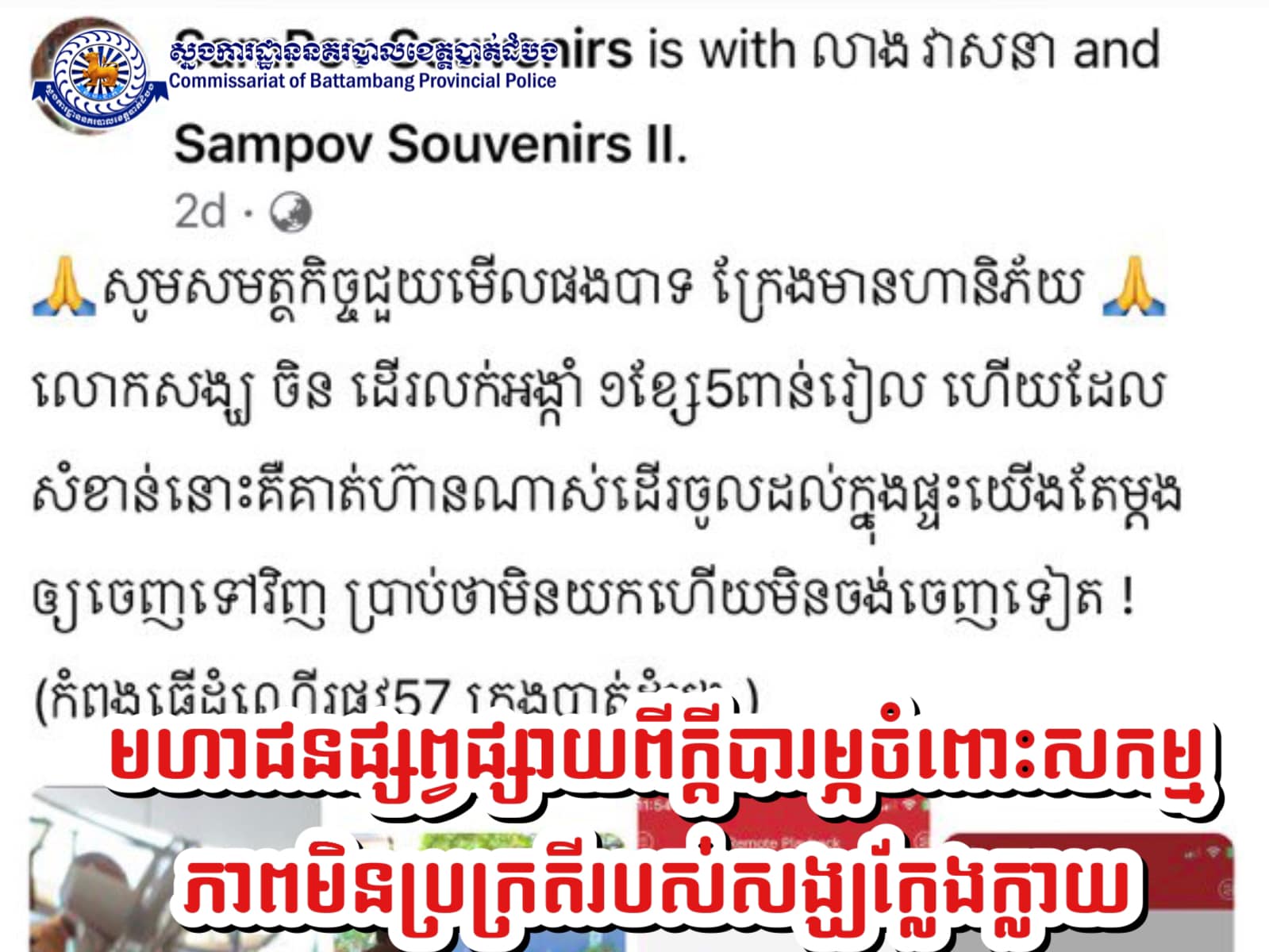 នាប៉ុន្មានថ្ងៃកន្លងទៅនេះ មានអ្នកប្រើប្រាស់បណ្តាញសង្គមបានបង្ហោះរូបភាពនិងផ្សព្វផ្សាយខ្លឹមសារអំពីសកម្មភាពមិនប្រក្រតីនៃអ្នកបួសក្នុងសាសនា បានធ្វើសកម្មភាពមិនល្អដូចជាការដើរលក់ខ្សែអង្កាំដោយកំណត់តម្លៃហើយចូលទៅក្នុងលំនៅដ្ឋានប្រជាពលរដ្ឋដោយមិនញញើត ក្រែង ឬដោយគ្មានការអនុញ្ញាត ដែលបញ្ហានេះបង្កឱ្យកើតមាននូវក្តីបារម្ភពីមហាជននៅក្នុងមូលដ្ឋានខេត្តបាត់ដំបង។