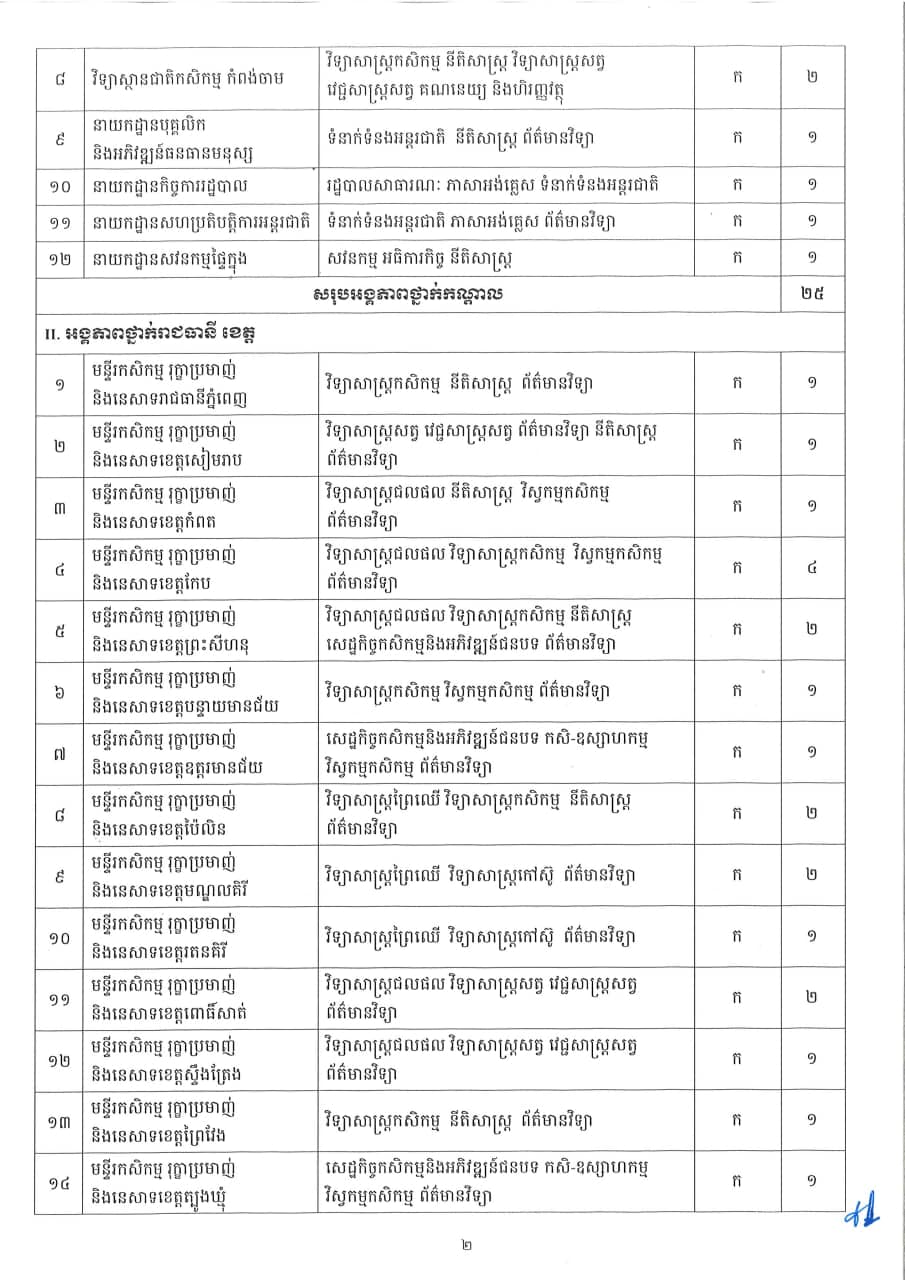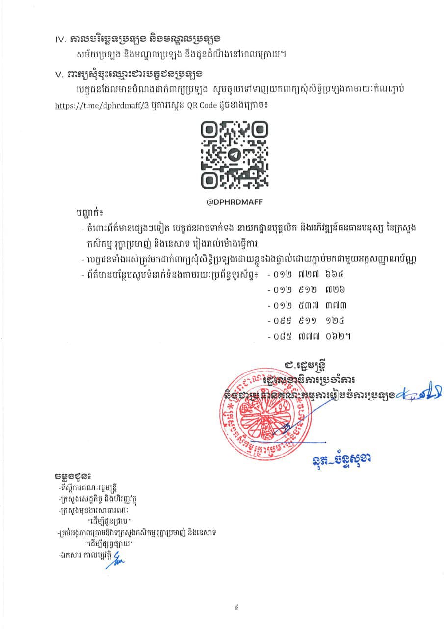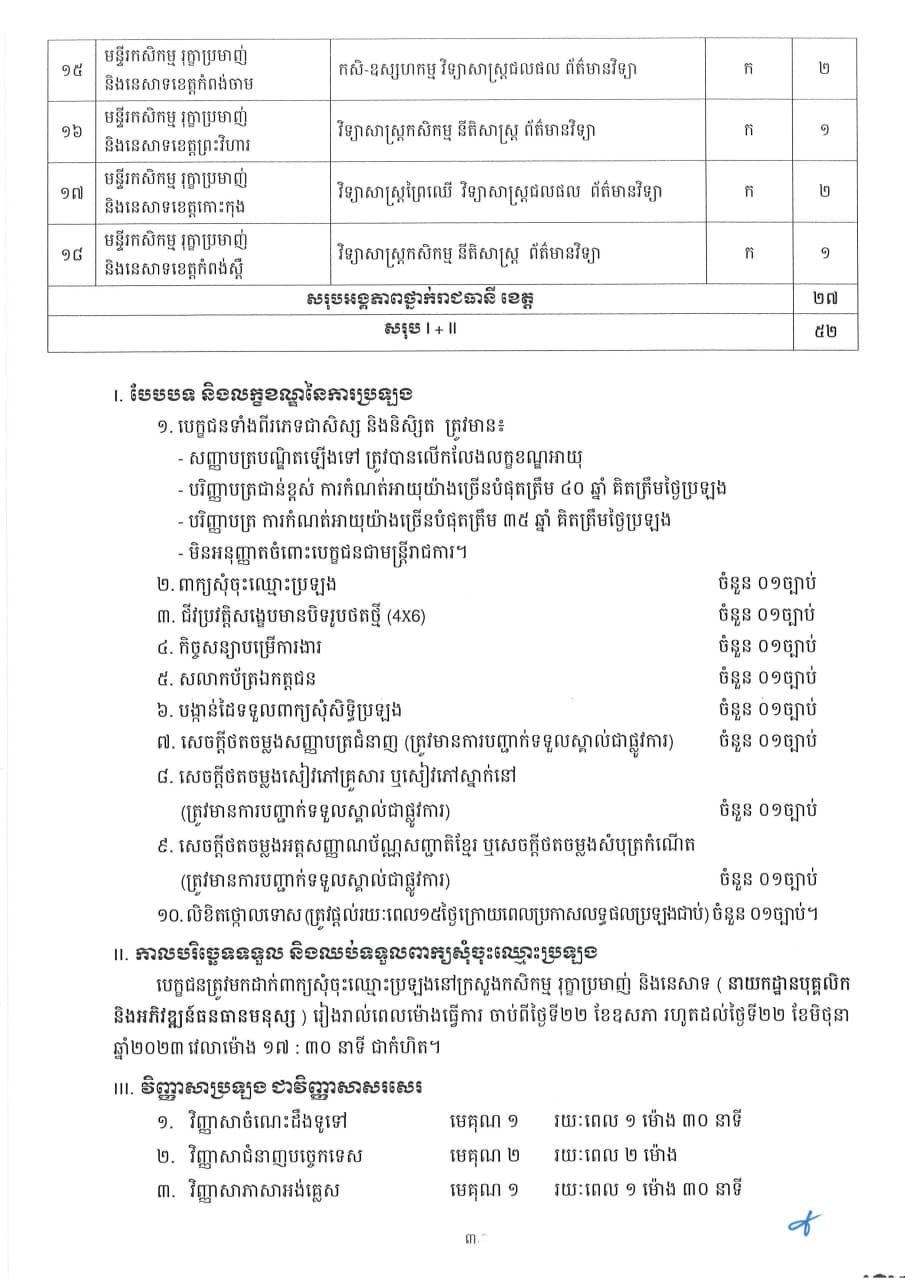 អនុវត្តតាមផែនការជ្រើសរើសក្របខ័ណ្ឌថ្មីឆ្នាំ២០២៣នេះ ក្រសួង កសិកម្ម រុក្ខាប្រមាញ់ និងនេសាទ សូមជូនដំណឹងជាសាធារណៈដល់សិស្ស និស្សិត ឱ្យបានជ្រាបថា ក្រសួងត្រូវការ ប្រឡងជ្រើសរើសមន្ត្រីបច្ចេកទេសជាន់ខ្ពស់ ចំនួន ៥២នាក់ សម្រាប់បម្រើការងារនៅអង្គភាពថ្នាក់កណ្ដាល និងមន្ទីរ កសិកម្ម រុក្ខាប្រមាញ់ និងនេសាទរាជធានី ខេត្ត ដែលនៅក្នុងនោះ បេក្ខជនជាជនពិការត្រូវបានលើកទឹកចិត្ត។