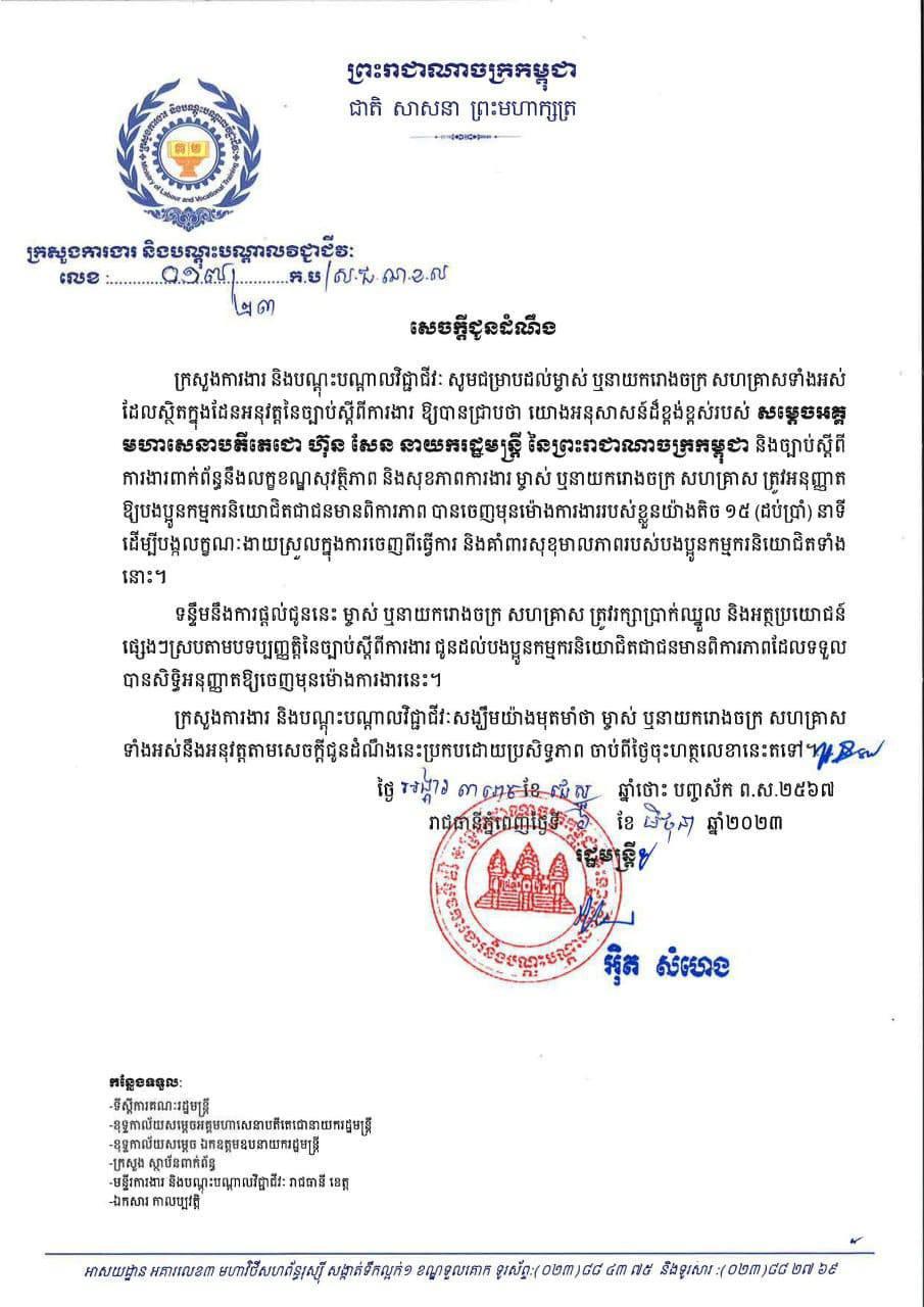 ក្រសួងការងារ និងបណ្តុះបណ្តាលវិជ្ជាជីវៈសង្ឃឹមយ៉ាងមុតមាំថា ម្ចាស់ ឬនាយករោងចក្រ សហគ្រាស ទាំងអស់នឹងអនុវត្តតាមសេចក្តីជូនដំណឹងនេះប្រកបដោយប្រសិទ្ធភាព ចាប់ពីថ្ងៃចុះហត្ថលេខានេះតទៅ ៕