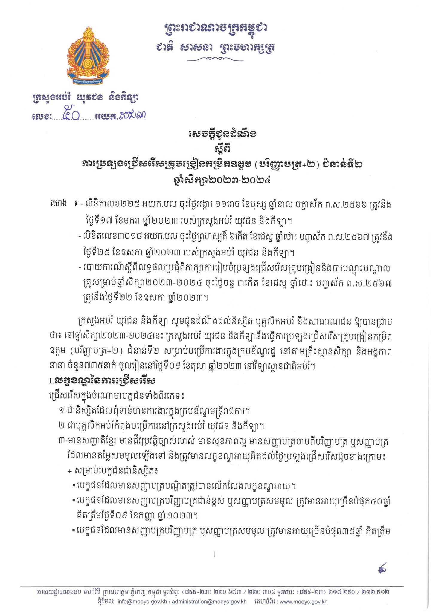 ក្រសួងអប់រំ យុវជន និងកីឡា សូមជូនដំណឹងដល់និស្សិត បុគ្គលិកអប់រំ និងសាធារណជន ឱ្យបានជ្រាប ឮថា៖ នៅឆ្នាំសិក្សា២០២៣-២០២៤នេះ ក្រសួងអប់រំ យុវជន និងកីឡានឹងធ្វើការប្រឡងជ្រើសរើសគ្រូបង្រៀនកម្រិត ឧត្តម (បរិញ្ញាបត្រ+២) ជំនាន់ទី២ សម្រាប់បម្រើការងារក្នុងក្របខ័ណ្ឌរដ្ឋ នៅតាមគ្រឹះស្ថានសិក្សា និងអង្គភាព នានា ចំនួន៧៣៥នាក់ ចូលរៀននៅថ្ងៃទី០៩ ខែតុលា ឆ្នាំ២០២៣ នៅវិទ្យាស្ថានជាតិអប់រំ ។