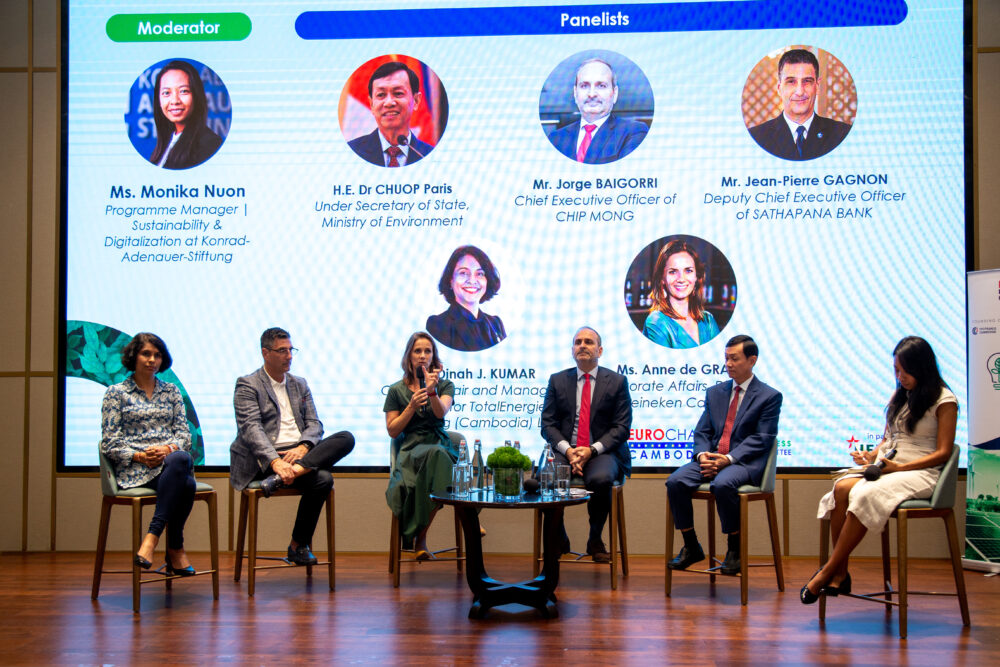 ភ្នំពេញ – កាលពីថ្ងៃទី ៩ ខែមិថុនា វេទិកាធុរកិច្ចបៃតងប្រចាំឆ្នាំរបស់គណៈកម្មាធិការធុរកិច្ចបៃតងនៃ សភាពាណិជ្ជកម្មអឺរ៉ុបនៅកម្ពុជា (EuroCham Cambodia) បានប្រមូលផ្តុំអ្នកដឹកនាំដែលមកពីវិស័យឧស្សា ហកម្ម អាជីវកម្ម អ្នកផ្តួចផ្តើមគំនិត និងអ្នកបង្កើតគោលនយោបាយដើម្បីពិភាក្សាអំពីវិធីពន្លឿនវឌ្ឍនភាពរបស់ប្រទេសកម្ពុជាឆ្ពោះទៅរកគោលដៅសេដ្ឋកិច្ចបៃតងរបស់ខ្លួន។