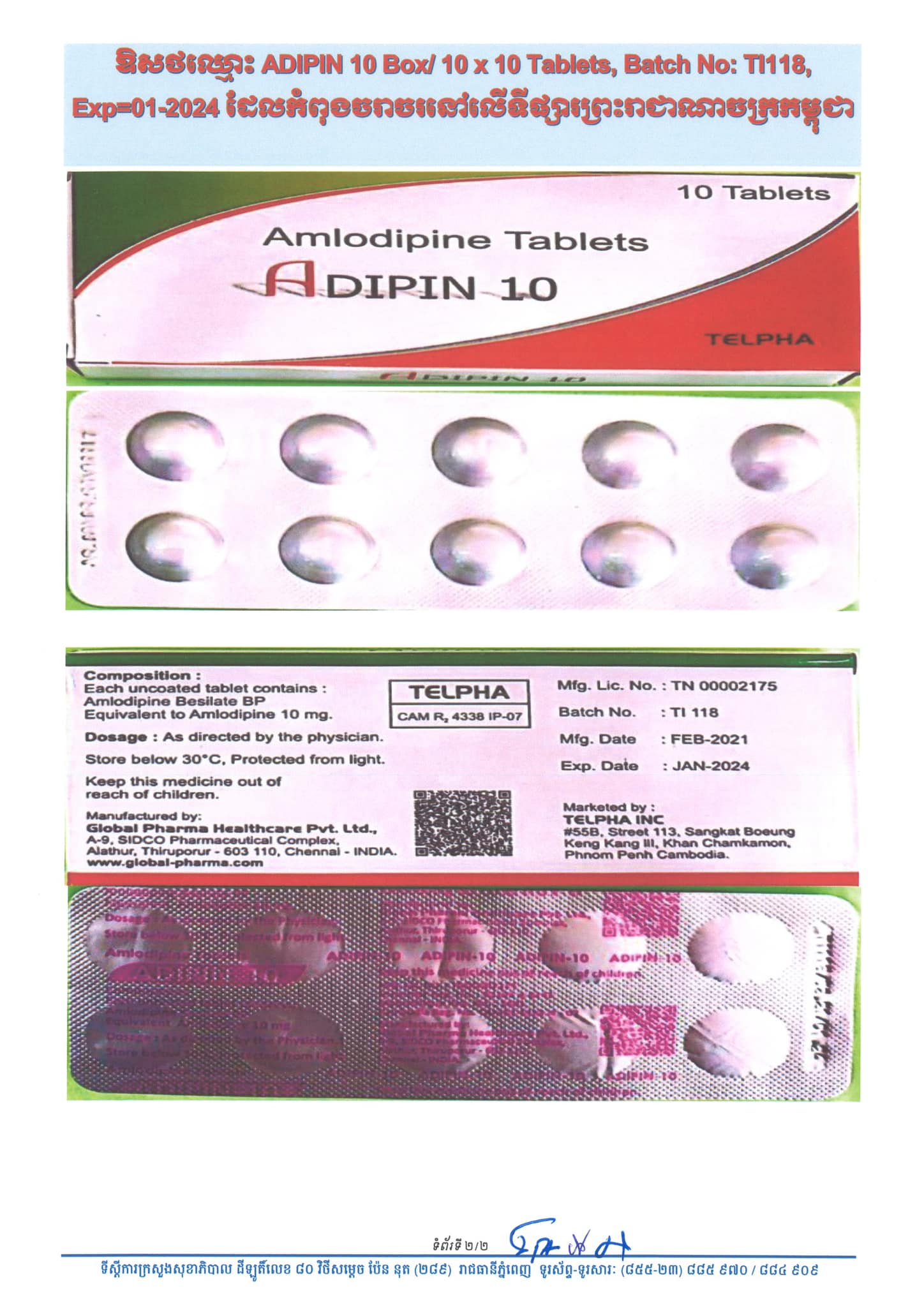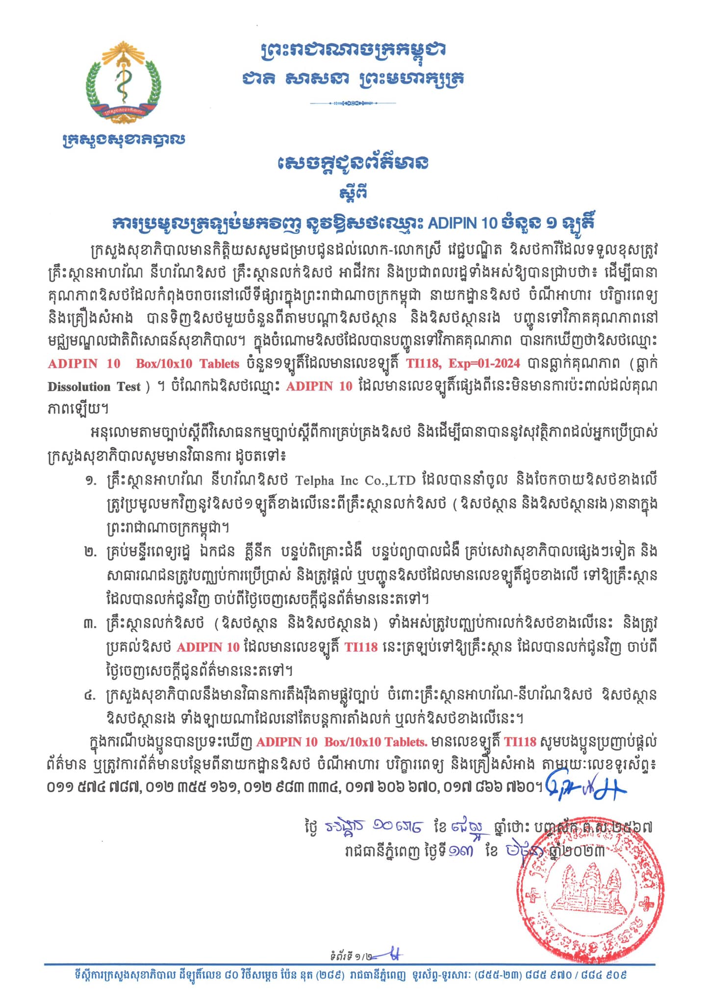ក្រសួងសុខាភិបាល ប្រកាសប្រមូលឱសថ ADIPIN 10 ចំនួន ១ឡូតិ៍ «TI 118» ត្រឡប់ពីទីផ្សារ