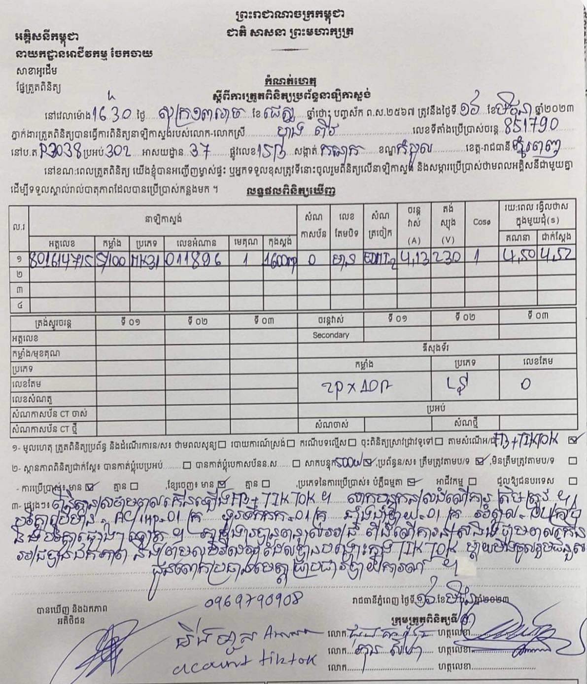 សូមជម្រាបថា អតិថិជនពុំបានចូលរួមពិនិត្យជាមួយក្រុមការងារបច្ចេកទេសទេ ប៉ុន្តែអតិថិជនបានអនុញ្ញាតឱ្យម្តាយមីងចូលរួម សហការពិនិត្យជំនួស។ ម្តាយមីងរបស់គាត់បានឯកភាពក្នុងការពិនិត្យតាមលក្ខណៈបច្ចេកទេសស្របតាមនីតិវិធី និងវិជ្ជាជីវៈត្រឹមត្រូវរបស់ក្រុមការងារ។ ទោះបីជាម្ចាស់គណនី Tik Tok ឈ្មោះ Āmm Mā មិនឯកភាព ប៉ុន្តែអតិថិជនបានទូទាត់ប្រាក់ប្រើប្រាស់ថាមពលប្រចាំខែបានទៀងទាត់ធម្មតា មិនមែនដូចការចុះផ្សាយរបស់អតិថិជននោះទេ។