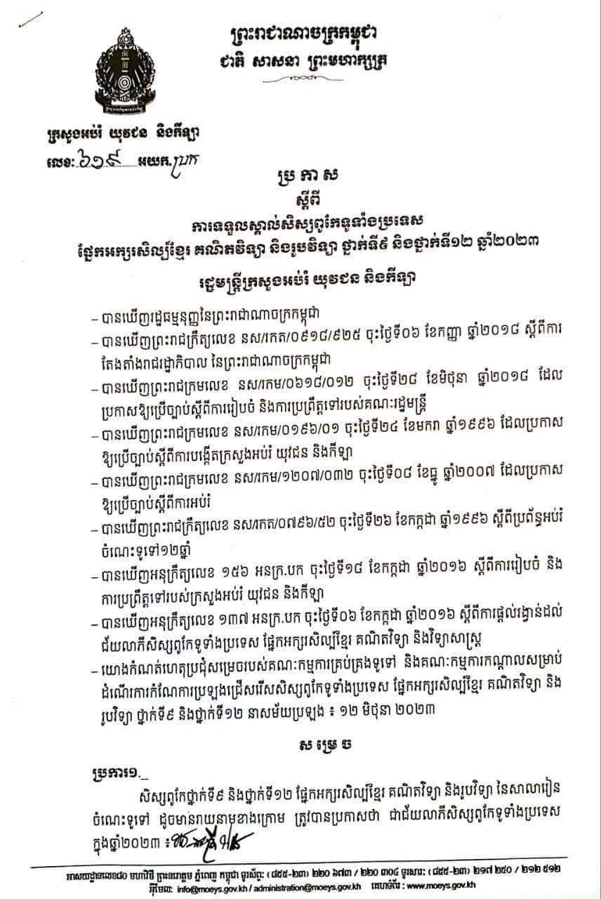 រាជធានីភ្នំពេញ៖ ក្រសួងអប់រំ យុវជន និងកីឡា បានប្រកាសអបអរសាទរចំពោះសិស្សានុសិស្សទាំង ៦០រូបដែលទទួលស្គាល់ថាជាសិស្សពូកែទូទាំងប្រទេស ទៅលើផ្នែកអក្សរសិល្ប៍ខ្មែរ គណិតវិទ្យា និងរូបវិទ្យា សម្រាប់ថ្នាក់ទី៩ និងថ្នាក់ទី១២ ឆ្នាំ២០២៣នេះ។ នេះបើយោងតាមគណនីហ្វេសប៊ុកផេកផ្ទាល់របស់ ក្រសួងអប់រំ យុវជន និងកីឡា បានផុសនៅថ្ងៃទី១៨ ខែមិថុនា ឆ្នាំ២០២៣មុននេះបន្តិច។