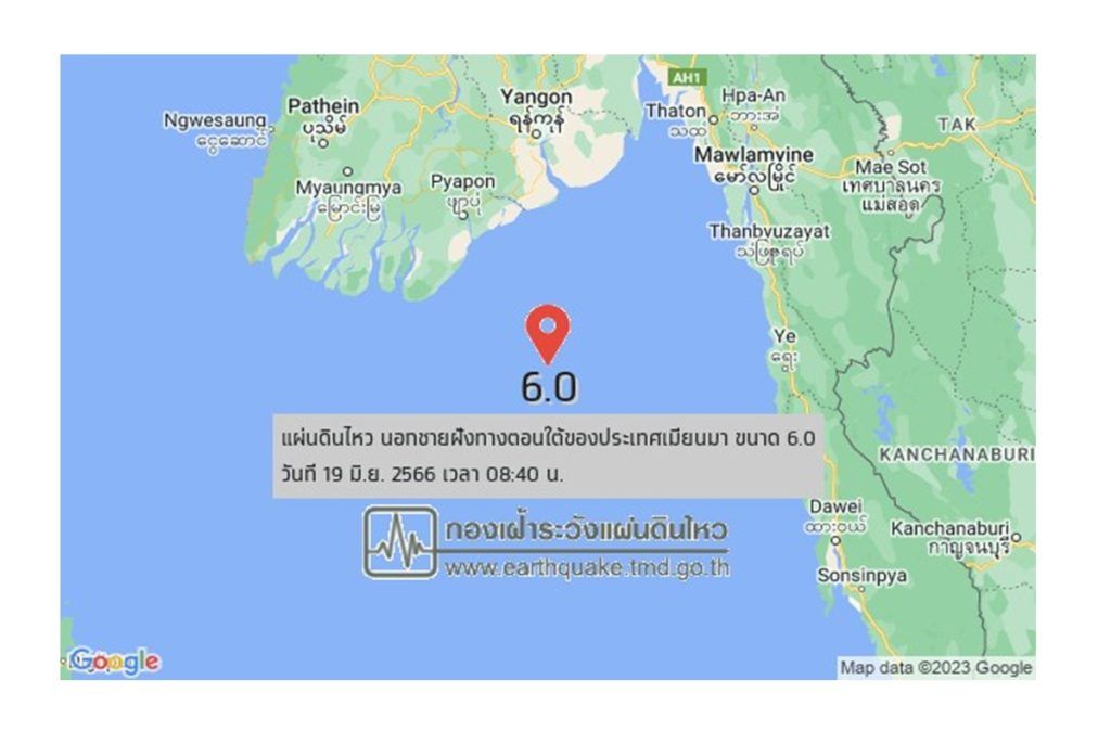 នាយកដ្ឋានអង្កេតការរញ្ជួយដីរបស់នាយកដ្ឋានឧតុនិយមថៃបានរាយការណ៍ថា គ្រោះរញ្ជួយដីកម្រិត ៦.០ រ៉ិចទ័រ ក្នុងជម្រៅ ១០ គីឡូម៉ែត្រ បានកើតឡើងនៅម៉ោង ៨ និង ៤០ នាទីព្រឹក ថ្ងៃចន្ទ ទី១៩ ខែមិថុនា ឆ្នាំ២០២៣ នៅតំបន់ឆ្នេរភាគខាងត្បូងនៃប្រទេសមីយ៉ាន់ម៉ា នេះបើតាមការចុះផ្សាយរបស់សារព័ត៌មាន បាងកកប៉ុស្តិ៍។
