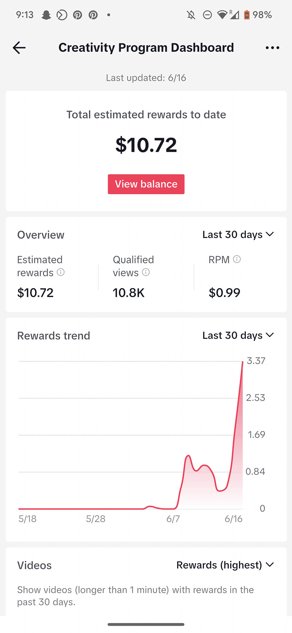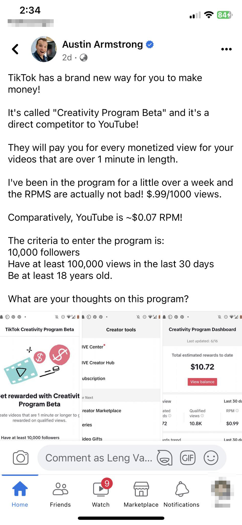 សម្រាប់អ្នកដែលចូលចិត្តរកប្រាក់ចំណូលតាមរយៈវីដេអូនៅលើអ៊ីនធឺណិត ឥឡូវនេះក្រុមហ៊ុន TikTok បានបើកឱ្យប្រើប្រាស់នូវវិធីរកលុយមួយ ហៅថា «Creativity Program Beta» ដែលជាគូប្រកួតប្រជែងផ្ទាល់ជាមួយ YouTube។ ក្រុមហ៊ុន TikTok ហ៊ានចំណាយរហូតដល់ ០.៩៩ ដុល្លារ រាល់ការចូលមើល ១,០០០ ដង (views) សម្រាប់វីដេអូលើសពី ១នាទី បើប្រៀបទៅនឹង YouTube ដែលហ៊ានឱ្យត្រឹមតែ ០.០៧ ដុល្លារ រៀងរាល់ការចូលមើល ១,០០០ ដងប៉ុណ្ណោះ។