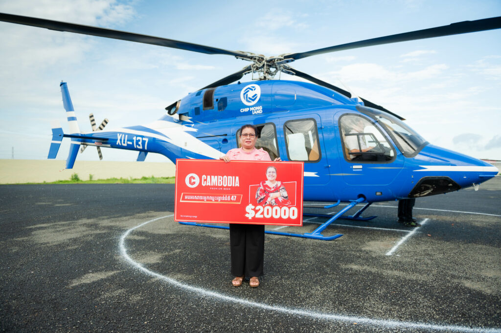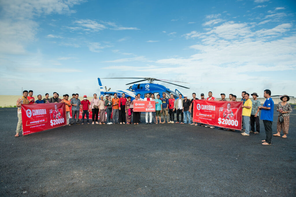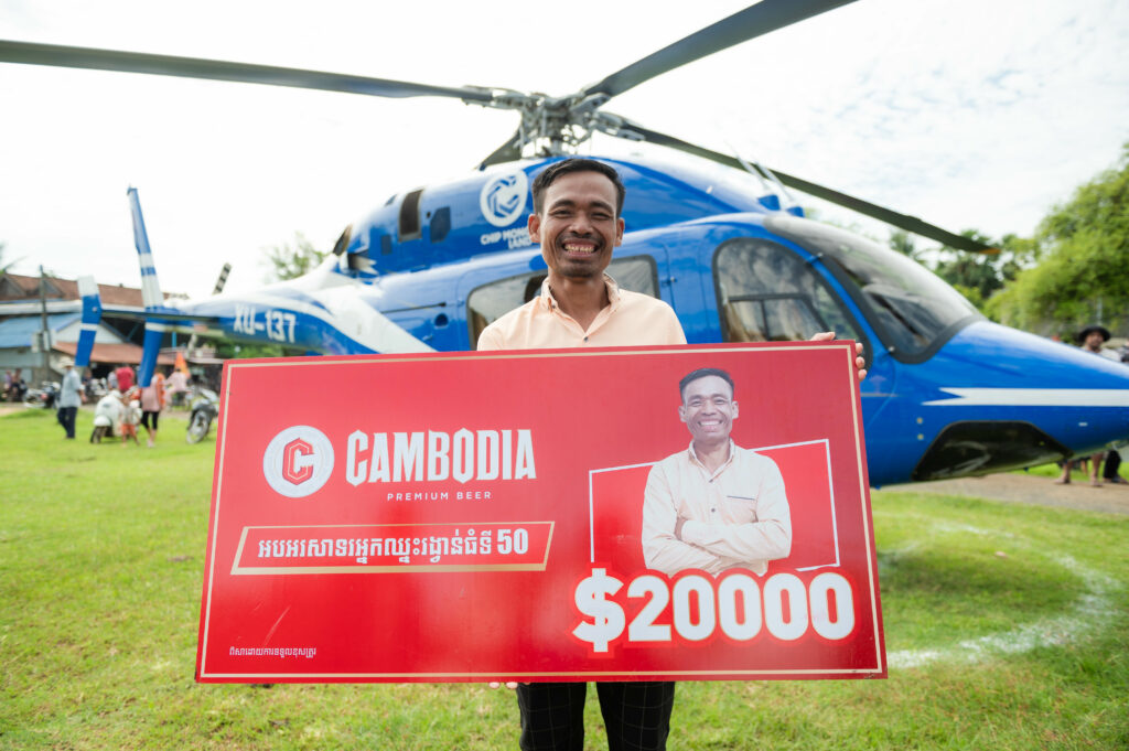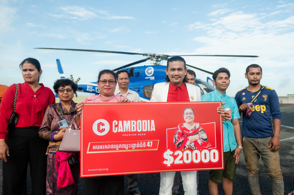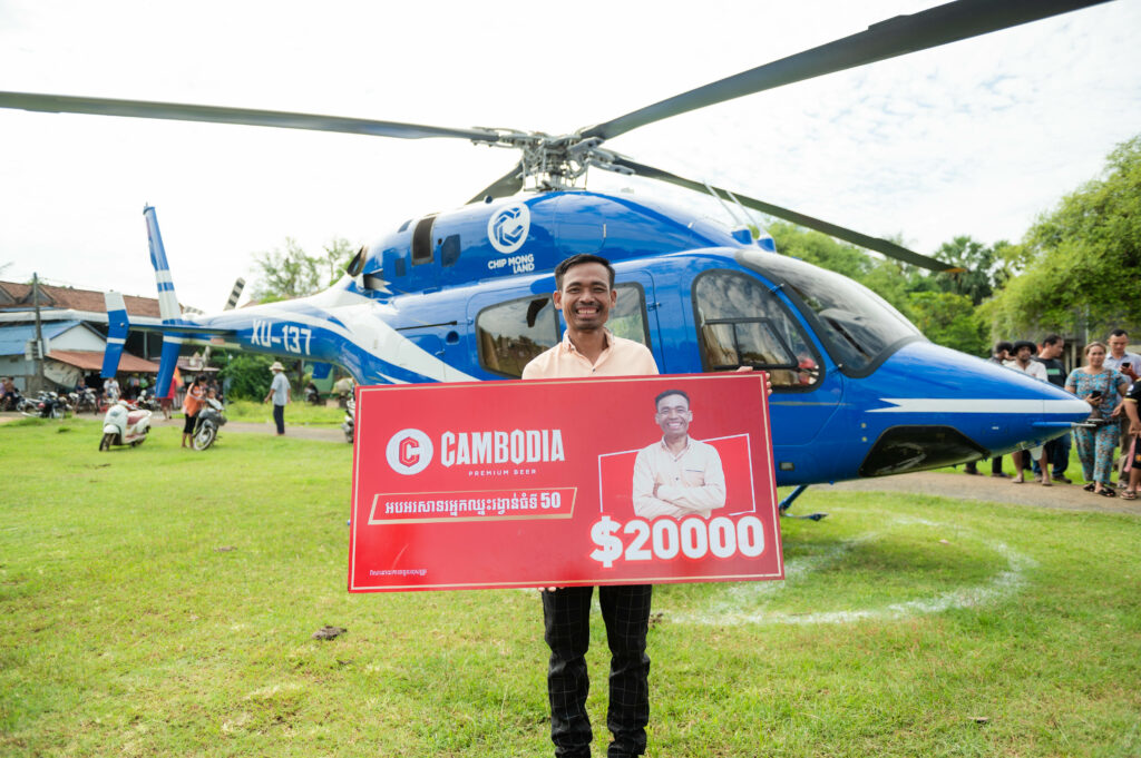 (ភ្នំពេញ)៖ អតិថិជនមហាសំណាង ចំនួន២រូប នៅខេត្តចំនួន២ផ្សេងគ្នាបានឈ្នះប្រាក់សុទ្ធ ២ម៉ឺនដុល្លារ ចំនួន២រង្វាន់ ពីក្រវិលកំប៉ុង CAMBODIA BEER។ អ្វីដែលកាន់តែពិសេសនោះ ក្រុមហ៊ុន ខ្មែរ ប៊ែរីជីស បានជិះ Helicopter ដឹកយករង្វាន់ទៅប្រគល់ជូនដល់ស្រុកកំណើត និងនាំពួកគាត់ ជិះ Helicopter ទស្សនាស្រុកកំណើតពីលើអាកាសទៀតផង។