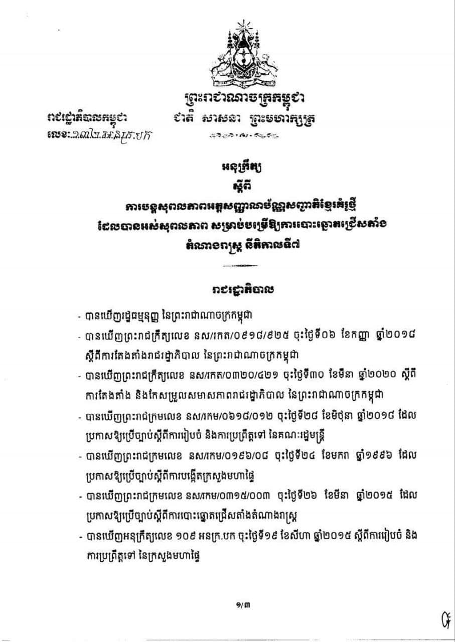 (ភ្នំពេញ)៖ រាជរដ្ឋាភិបាលកម្ពុជា បានចេញអនុក្រឹត្យស្ដីពីការ បន្តសុពលភាពអត្តសញ្ញាណប័ណ្ណសញ្ជាតិខ្មែរគំរូថ្មី ដែលបានអស់សុពលភាព សម្រាប់បម្រើឱ្យការបោះឆ្នោតជ្រើតាំងតំណាងរាស្រ្ត នីតិកាលទី៧ នាថ្ងៃទី២៣ ខែកក្កដា ឆ្នាំ២០២៣ ខាងមុខនេះ តាមសំណើរបស់ក្រសួងមហាផ្ទៃ។