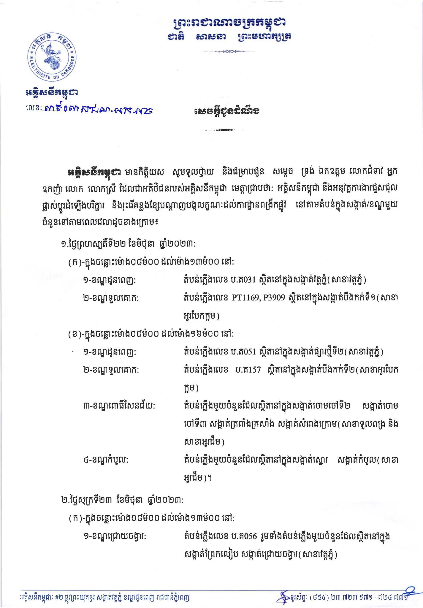 រាជធានីភ្នំពេញ៖ យោងតាមការចុះផ្សាយរបស់ អគ្គិសនីកម្ពុជា បានចេញសេចក្តីជូនដំណឹងស្តីពីការអនុវត្តការងារជួសជុល ផ្លាស់ប្តូរតម្លើងបរិក្ខារនានា និងរុះរើគន្លងខ្សែបណ្តាញអគ្គិសនីរបស់អគ្គិសនីកម្ពុជា ដើម្បីបង្កលក្ខណៈងាយស្រួលដល់ការដ្ឋានពង្រីកផ្លូវ នៅថ្ងៃទី២២ ខែមិថុនា ឆ្នាំ២០២៣ ដល់ថ្ងៃទី២៥ ខែមិថុនា ឆ្នាំ២០២៣ នៅតំបន់មួយចំនួនទៅតាមពេលវេលា និងទីកន្លែងដូចសេចក្តីជូនដំណឹងលម្អិតខាងក្រោម។