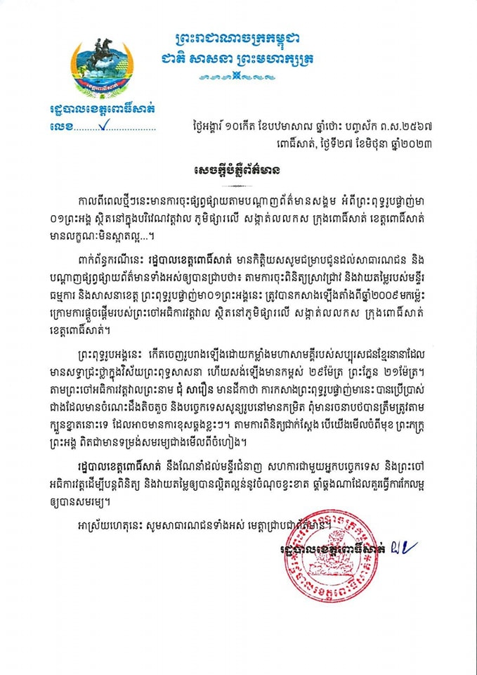 ខេត្តពោធិ៍សាត់៖ យោងតាមការចុះផ្សាយរបស់ រដ្ឋបាលខេត្តពោធិ៍សាត់ បានចេញសេចក្ដីបំភ្លឺព័ត៌មាន ជុំវិញការចុះផ្សព្វផ្សាយតាមបណ្ដាញព័ត៌មានសង្គម អំពីព្រះពុទ្ធរូបផ្ចាញ់មា ០១ព្រះអង្គ ស្ថិតនៅក្នុងបរិវេណវត្តវាល ភូមិផ្សារលើ សង្កាត់លលកស ក្រុងពោធិ៍សាត់ ខេត្តពោធិ៍សាត់ មានលក្ខណៈមិនស្អាតល្អ…។