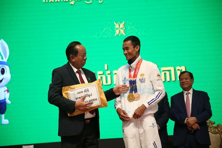 ឯកឧត្តមបណ្ឌិត ថោង ខុន រដ្ឋមន្ត្រីក្រសួងទេសចរណ៍ និងជាអនុប្រធានអចិន្ត្រៃយ៍ CAMSOC-CAMAPGOC បានគូសបញ្ជាក់ នៅក្នុងកម្មវិធីបូកសរុបការងារ SEA Games-ASEAN Para Games ឆ្នាំ២០២៣ និងពិធីជូនប្រាក់រង្វាន់ជ័យលាភីកីឡា SEA Games និង ASEAN Para Games នៅថ្ងៃទី២៧ ខែមិថុនា ឆ្នាំ២០២៣នេះថា ដោយទទួលបានការយកចិត្ត ទុកដាក់ ខ្ពស់ពីរាជរដ្ឋាភិបាល ក្នុងការលើកទឹកចិត្ត ជំរុញទឹកចិត្ត កីឡាករ-កីឡាការិនីជាតិ រាជ រដ្ឋា ភិ បាលបានចេញអនុក្រឹត្យផ្ដល់ប្រាក់រង្វាន់ជូនអត្តពលិកជាតិ និងគ្រូបង្វឹក-គ្រូជំនួយ ដណ្ដើម បានជ័យលាភីមេដាយមាស ប្រាក់ សំរឹទ្ធ តាមកម្រិតការប្រកួតពហុកីឡា ដូចជា មេដាយមាស កីឡាករ ឬកីឡាការិនីម្នាក់ទទួលបាន ៤០លានរៀល, មេដាយប្រាក់ កីឡាករ ឬកីឡាការិនីម្នាក់ទទួលបាន ៣០លានរៀល និងមេដាយសំរឹទ្ធ កីឡាករ ឬកីឡាការិនីម្នាក់ទទួលបាន ១៦លានរៀល។ រីឯគ្រូបង្វឹកបង្គោលបានស្មើ នឹងកីឡាករ មេដាយ ខ្ពស់បំផុតរបស់ខ្លួន និងគ្រូបង្វឹកជំនួយបាន ៧០ភាគរយ នៃគ្រូបង្វឹកបង្គោល។