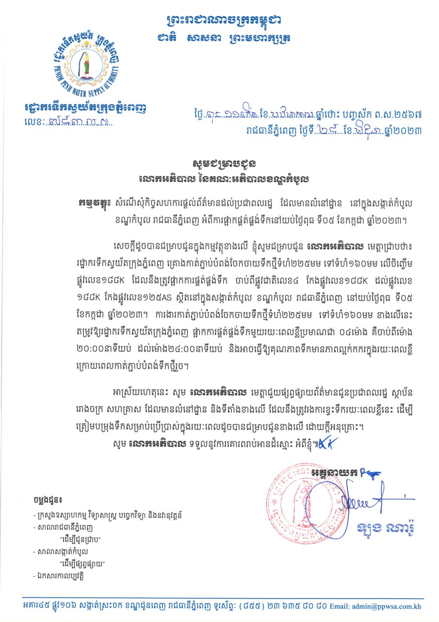 ២. នៅយប់ថ្ងៃពុធ ទី០៥ ខែកក្កដា ឆ្នាំ២០២៣ គ្រោងកាត់ភ្ជាប់បំពង់ចែកចាយទឹកស្អាតទំហំ ២២៥មម ទៅបំពង់ចែកចាយទឹកស្អាតទំហំ ១៦០មម នៅលើផ្លូវលេខ១៨៨K ចាប់ពីផ្លូវជាតិលេខ៤ កែងផ្លូវលេខ១៨៨K ដល់ផ្លូវលេខ១៨៨K កែងផ្លូវលេខ១២៥AS ស្ថិតក្នុងសង្កាត់កំបូល ខណ្ឌកំបូល រាជធានីភ្នំពេញ។