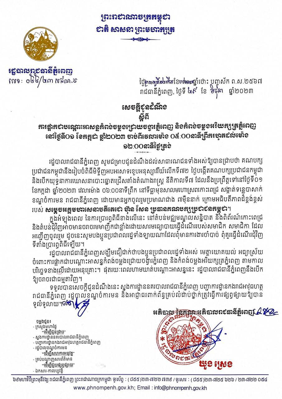 រដ្ឋបាលរាជធានីភ្នំពេញ សូមជម្រាបជូនដំណឹងដល់សាធារណជនទាំងអស់ឱ្យបានជ្រាបថា គណបក្ស ប្រជាជនកម្ពុជានឹងរៀបចំពិធីមិទ្ទិញអបអរសាទរខួបអនុស្សាវរីយ៍លើកទី៧២ ថ្ងៃបង្កើតគណបក្សប្រជាជនកម្ពុជា និងបើកយុទ្ធនាការឃោសនាបោះឆ្នោតជ្រើសតាំងតំណាងរាស្ត្រ នីតិកាលទី៧ ដែលនឹងប្រព្រឹត្តទៅនៅថ្ងៃទី០១ ខែកក្កដា ឆ្នាំ២០២៣ វេលាម៉ោង ០៦៖០០នាទីព្រឹក នៅទីធ្លាមុខសាលមហោស្រពកោះពេជ្រ សង្កាត់ទន្លេបាសាក់ ខណ្ឌចំការមន រាជធានីភ្នំពេញ ដោយមានអ្នកចូលរួមប្រមាណជាង ៧ម៉ឺននាក់ ក្រោមអធិបតីភាពដ៏ខ្ពង់ខ្ពស់របស់ សម្តេចអគ្គមហាសេនាបតីតេជោ ហ៊ុន សែន ប្រធានគណបក្សប្រជាជនកម្ពុជា។