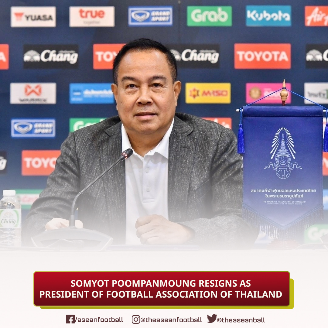 ប្រធានសមាគមបាល់ទាត់ថៃ (FAT) លោក Somyot Poompanmoung បានប្រកាសថា លោកត្រៀមខ្លួនជាស្រេចក្នុងការលាលែងពីតំណែង តាមសំណើរបស់ឧបនាយករដ្ឋមន្ត្រីថៃ Prawit Wongsuwan។ ជាមួយគ្នានេះ លោក Somyot នឹងជូនដំណឹងអំពីលទ្ធផល ក៏ដូចជាមូលហេតុនៃការលាលែងពីតំណែងទៅកាន់សហព័ន្ធបាល់ទាត់អាស៊ាន (AFF) សហព័ន្ធបាល់ទាត់អាស៊ី (AFC) និងសហព័ន្ធបាល់ទាត់អន្តរជាតិ (FIFA)។