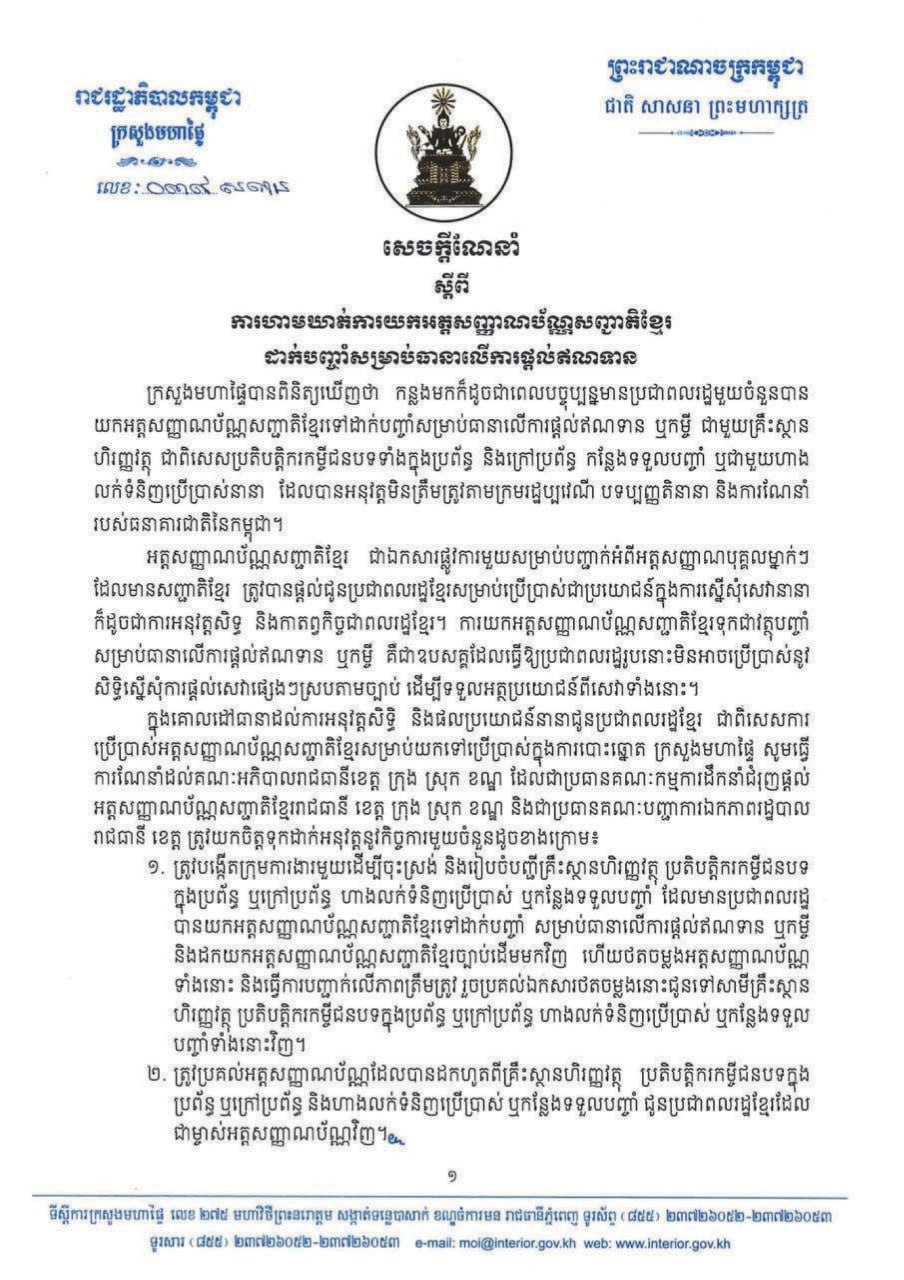 ក្រសួងមហាផ្ទៃ ហាមឃាត់ការយកអត្តសញ្ញាណប័ណ្ណ ដាក់បញ្ចាំដើម្បីខ្ចីប្រាក់ ក្នុងករណីរកឃើញត្រូវដាក់ទណ្ឌកម្មតាមច្បាប់ ឬបិទអាជីវកម្មនោះតែម្ដង
