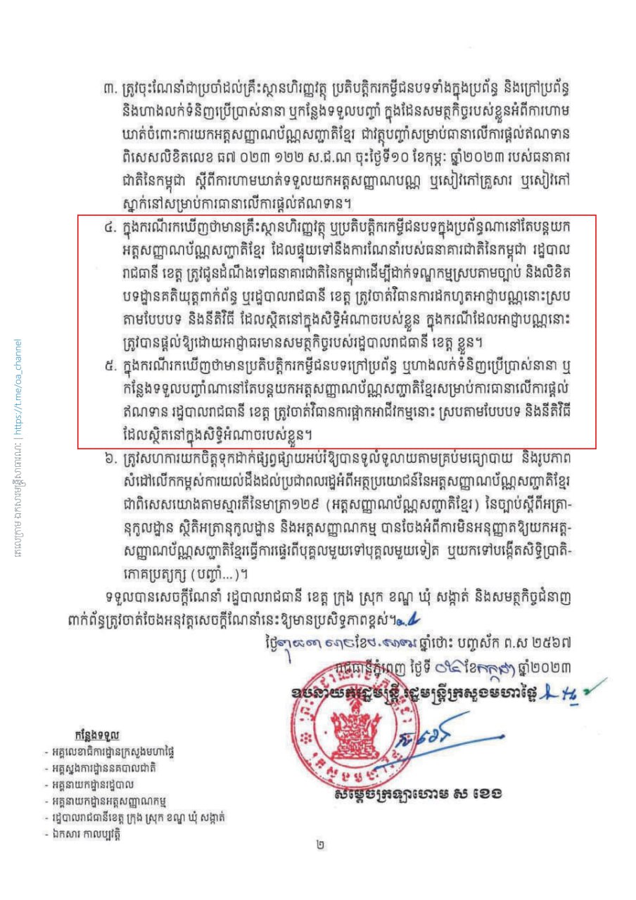 បន្ថែមទៅទៀតនោះ ក្នុងករណីរកឃើញថាមានប្រតិបត្តិករកម្ចីជនបទក្រៅប្រព័ន្ធ ឬហាងលក់ទំនិញប្រើប្រាស់នានា ឬ កន្លែងទទួលបញ្ចាំណានៅតែបន្តយកអត្តសញ្ញាណប័ណ្ណសញ្ជាតិខ្មែរសម្រាប់ការធានាលើការផ្តល់ ឥណទាន រដ្ឋបាលរាជធានី ខេត្ត ត្រូវចាត់វិធានការផ្អាកអាជីវកម្មនោះ ស្របតាមបែបបទ និងនីតិវិធី ដែលស្ថិតនៅក្នុងសិទ្ធិអំណាចរបស់ខ្លួន ៕