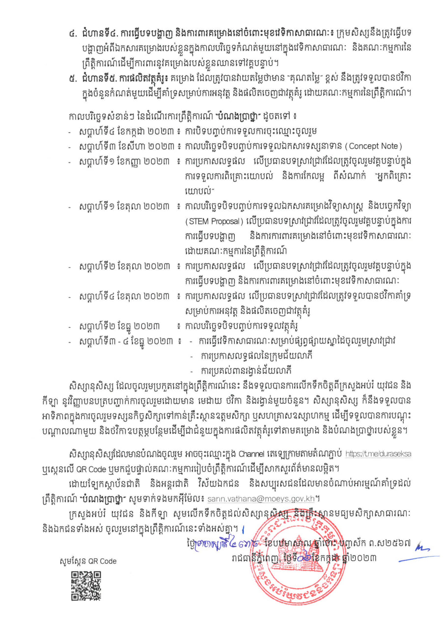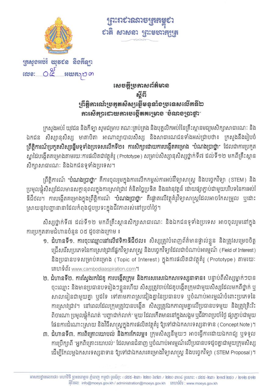 ក្រសួងអប់រំ នឹងរៀបចំ ព្រឹត្តិការណ៍ប្រកួតសិស្សឆ្នើមទូទាំងប្រទេសលើកទី២៖ ការសិក្សាដោយការបង្កើតគម្រោង “បំណងប្រាថ្នា” ដែលជាការប្រកួត ស្នាដៃបង្កើតគម្រោងតាមរយៈការផលិតជាវត្ថុគំរូ (Prototype) សម្រាប់សិស្សានុសិស្សថ្នាក់ទី៧ ដល់ទី១២ មកពីគ្រឹះស្ថាន សិក្សាសាធារណៈ និងឯកជនទូទាំងប្រទេស។