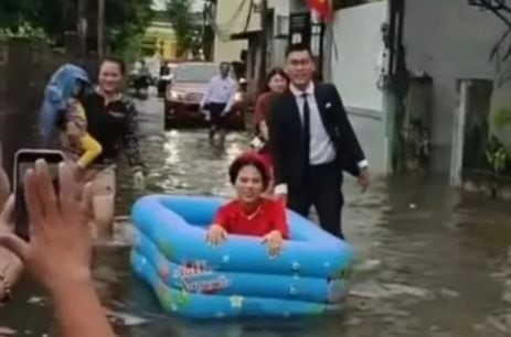 ជំនន់ទឹកភ្លៀងដ៏ឆាប់រហ័សបានបង្ខំឲ្យកូនក្រមុំវៀតណាមម្នាក់ត្រូវអង្គុយក្នុងពោងក្នុងថ្ងៃរៀបការ
